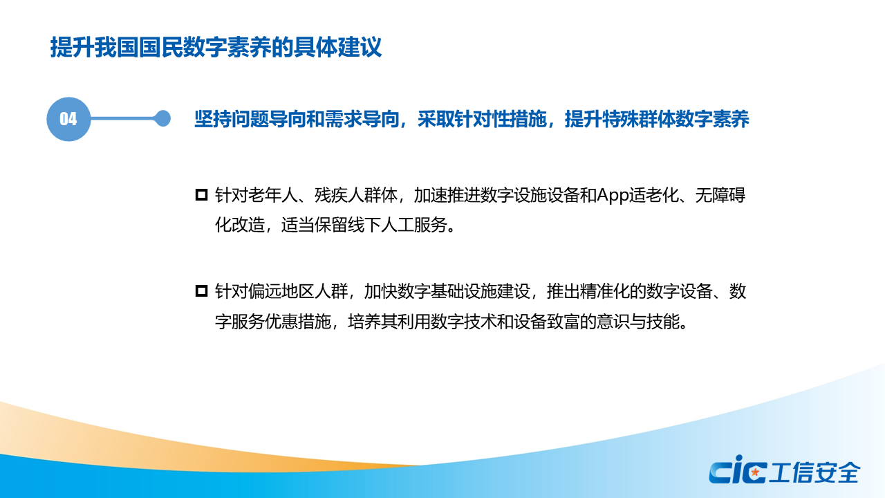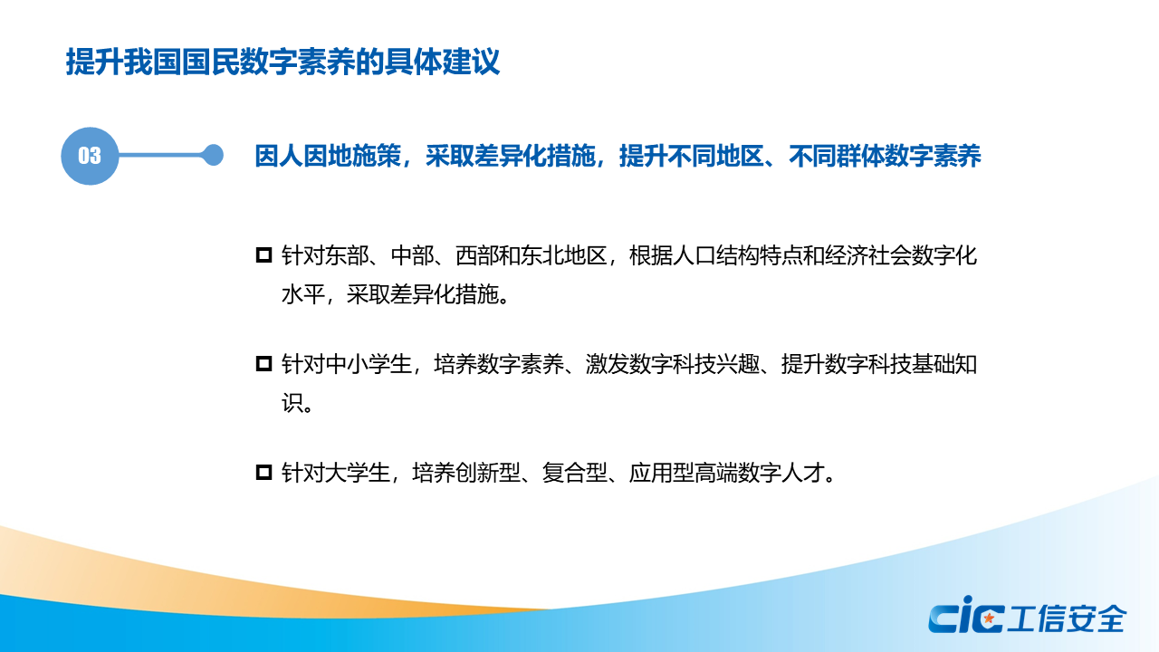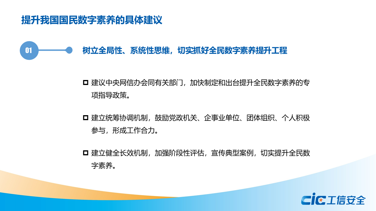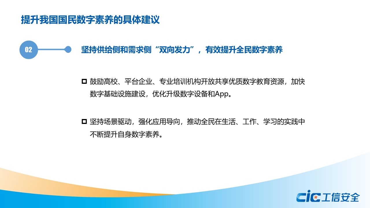蒋艳提出,提升我国国民数字素养要坚持“两个并重”,即供给和需求并重、技能和素养并重,从供给侧扩大优质数字资源供给,从需求侧围绕生活、工作、学习打造全民数字素养与技能应用场景,从安全角度提高全民数字安全技能水平,从伦理道德角度强化全民数字社会道德规范,切实抓好全民数字素养提升工程,从而推动实现高质量发展、高效能治理、高品质生活、高水平开放、高素质文明。