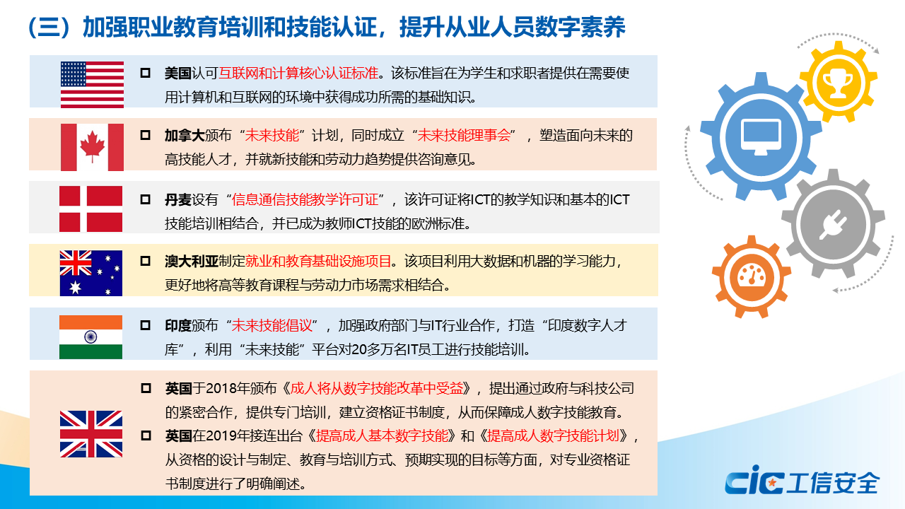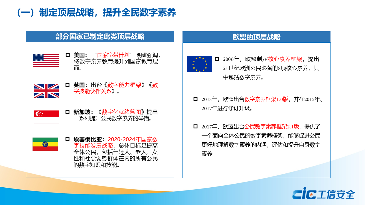蒋艳指出,数字素养是数字经济社会中公民工作生活学习应具备的数字获取、制作、使用、评价、交互、分享、创新、安全保障、伦理道德等一系列素质与能力的集合。全球主要国家和地区纷纷制定顶层战略,实施相关政策,开展数字教育专项行动,加强职业教育培训和技能认证,推出面向特殊群体的友好性专项政策,提升全民数字素养。