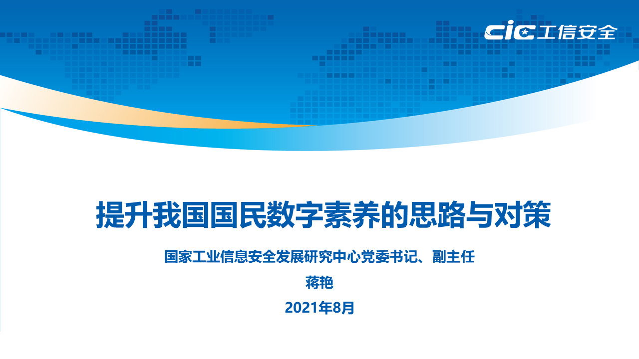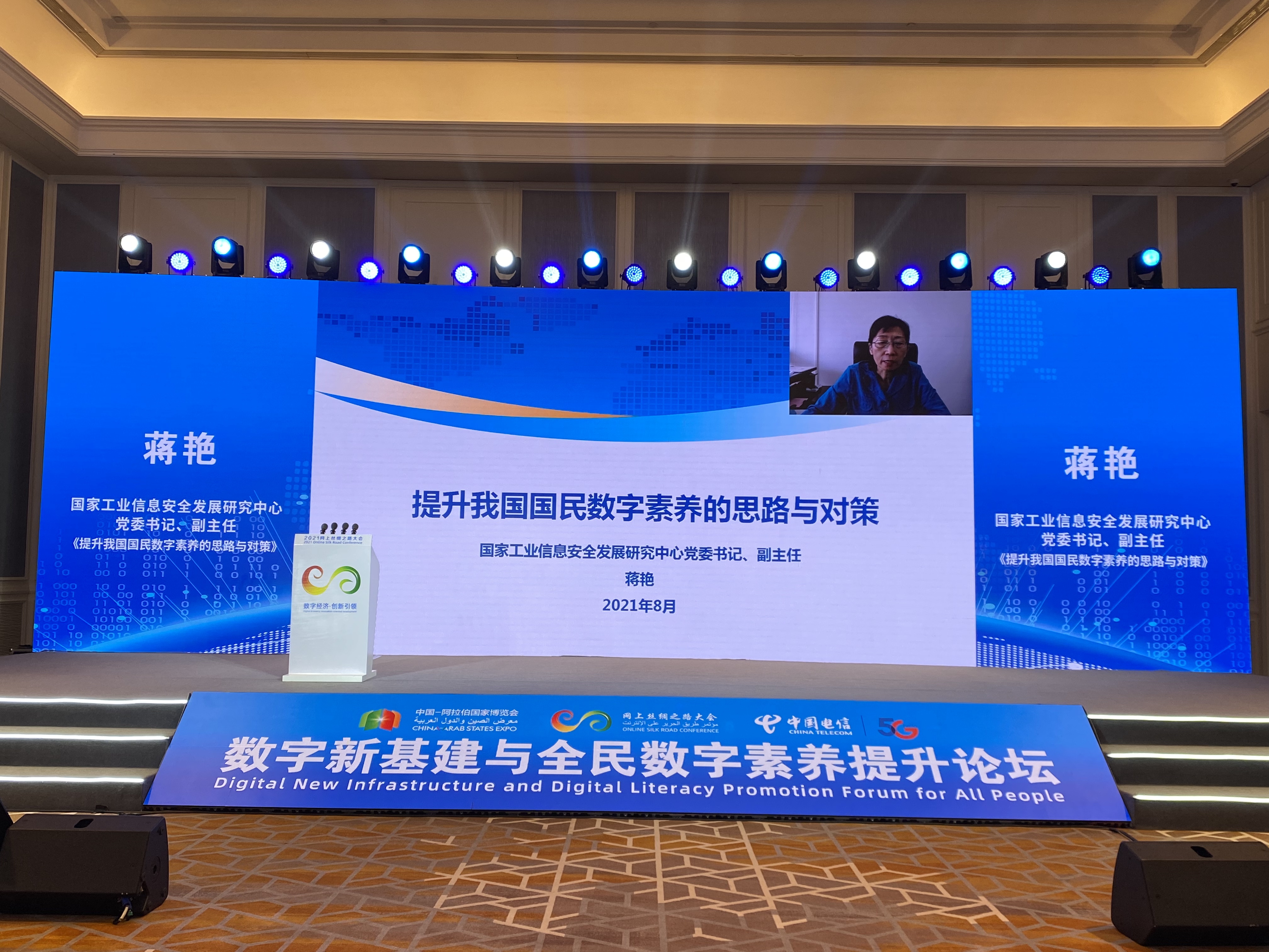 8月20日,2021网上丝绸之路大会数字新基建与全民数字素养提升论坛在宁夏银川市召开,国家工业信息安全发展研究中心党委书记、副主任蒋艳受邀以线上方式参会,并就“提升我国国民数字素养的思路与对策”发表主旨演讲。