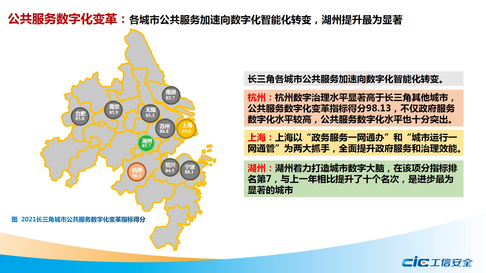 从长三角数字经济发展城市画像来看,数字基础设施方面,杭州连续三年在长三角城市中排名第一,常州、温州、绍兴等城市数字基础支撑能力快速崛起;数字产业方面,上海发挥其科技创新优势,领衔长三角地区数字产业发展,宁波、无锡、湖州是发展较为迅速的城市,排名与上年相比提升了五位以上;产业数字化转型方面,苏州、上海、宁波依托各自的产业优势,加速农业、工业、服务业数字化转型,合肥后发优势明显,从2020年的第11名升至2021年的第4名,排名大幅跃升;公共服务数字化变革方面,长三角各城市公共服务加速向数字化智能化转变,湖州着力打造城市数字大脑,排名提升最为显著;数字经济生态环境方面,得分前十的城市排名波动变化较小,除了湖州提升了三位以外,其他城市排名上下变化在两位以内,反映了长三角城市群整体数字经济外部环境呈现稳定向好的发展态势。