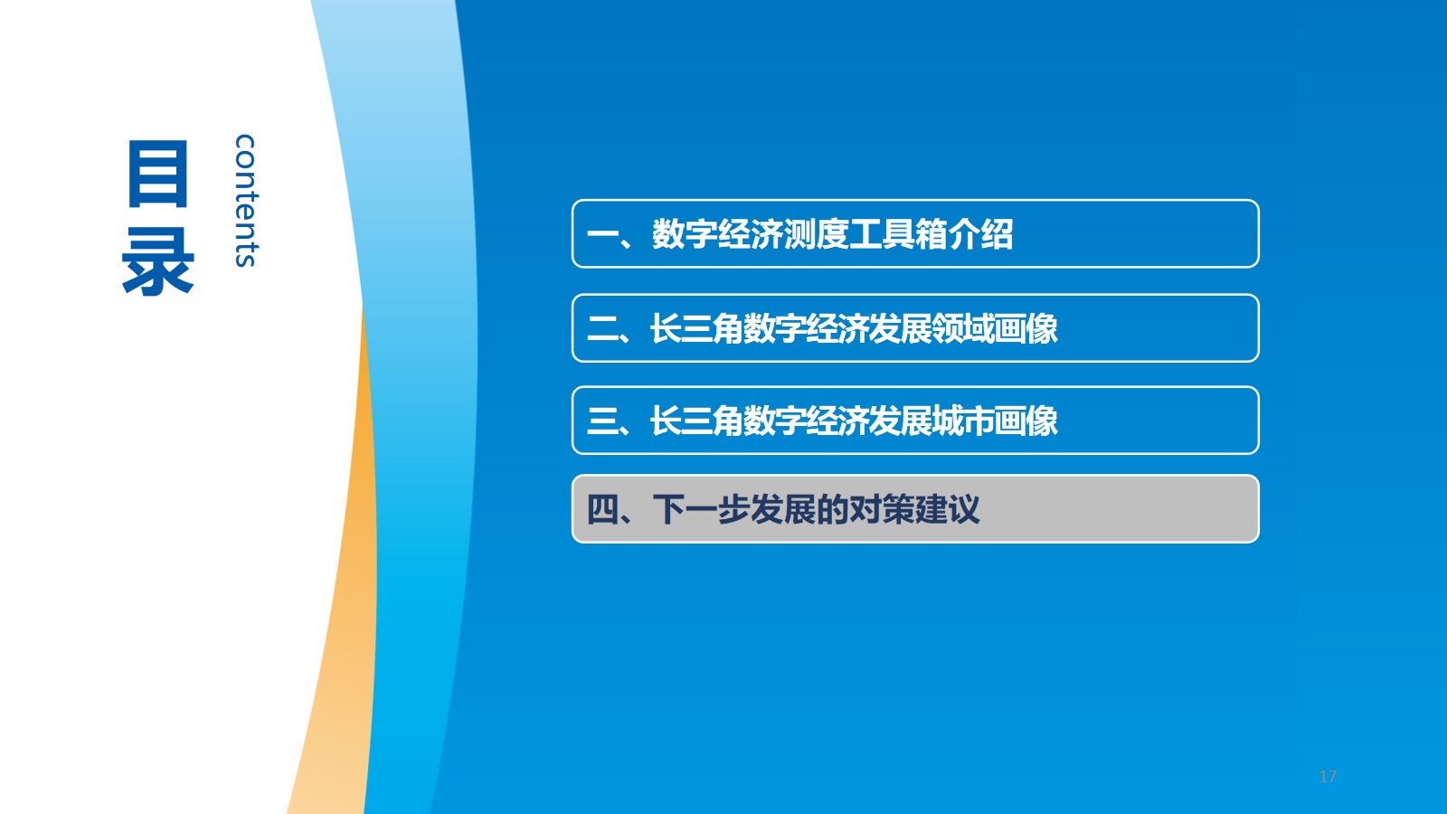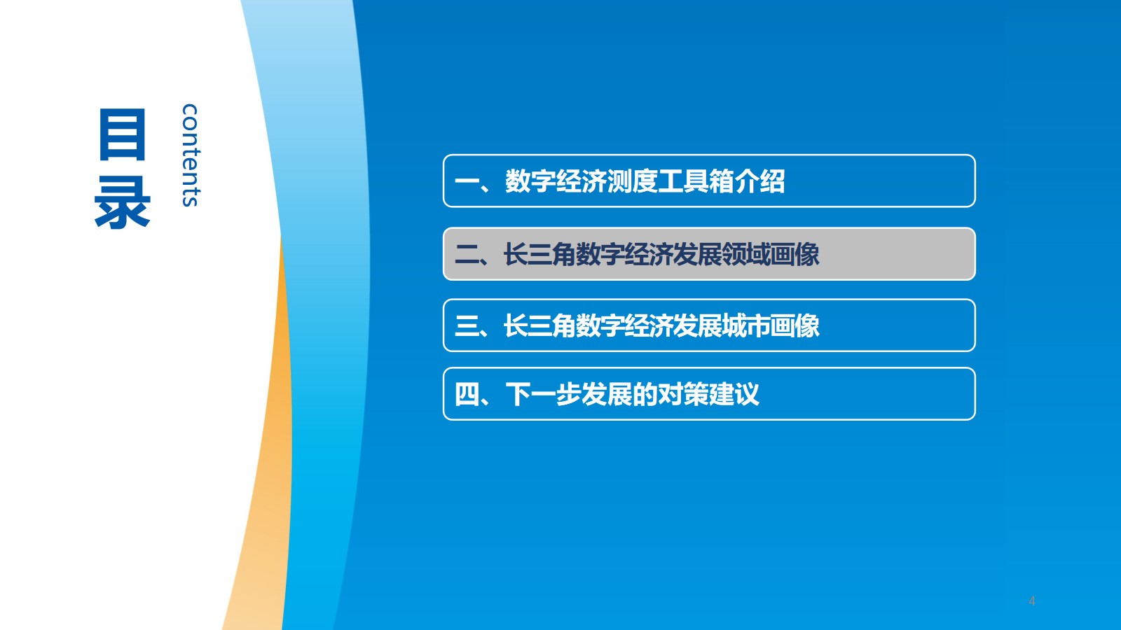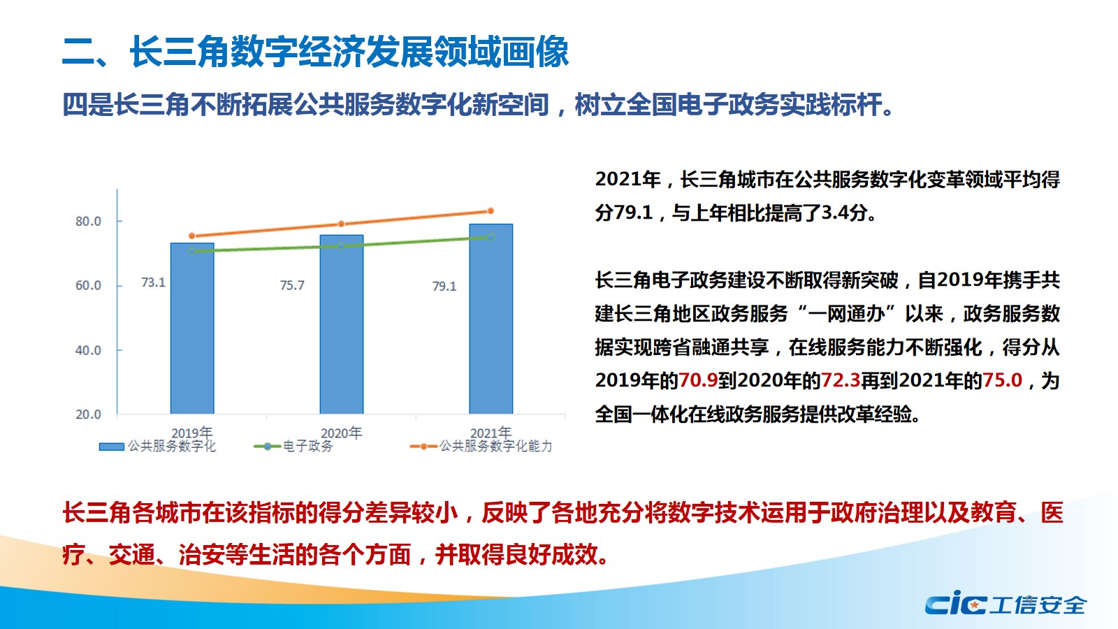 从长三角数字经济发展领域画像来看,数字基础设施建设水平较上年提升明显,得分从2020年的52.1上升至2021年的54.6,较上年同期增长4.8%,以5G为代表的新型信息基础设施加速建设;各地合力打造数字产业发展高地,2021年得分49.5,同比增长率从2020年的3.7%增长至2021年的4.0%,其中数字先导产业得分同比增长率高达12.4%;服务业数字化转型与上年相比增长了9.1%,其次是工业6.5%和农业2.5%,服务业新模式新业态蓬勃发展;公共服务数字化新空间不断拓展,电子政务分指标得分从2019年的70.9到2020年的72.3再到2021年的75.0,为全国一体化在线政务服务提供改革经验;数字经济生态环境整体呈现稳中向好态势,比2020年得分增长6.5%,较2019年增长9.8%,经济、创新、营商、安全、人才环境均走在全国前列。