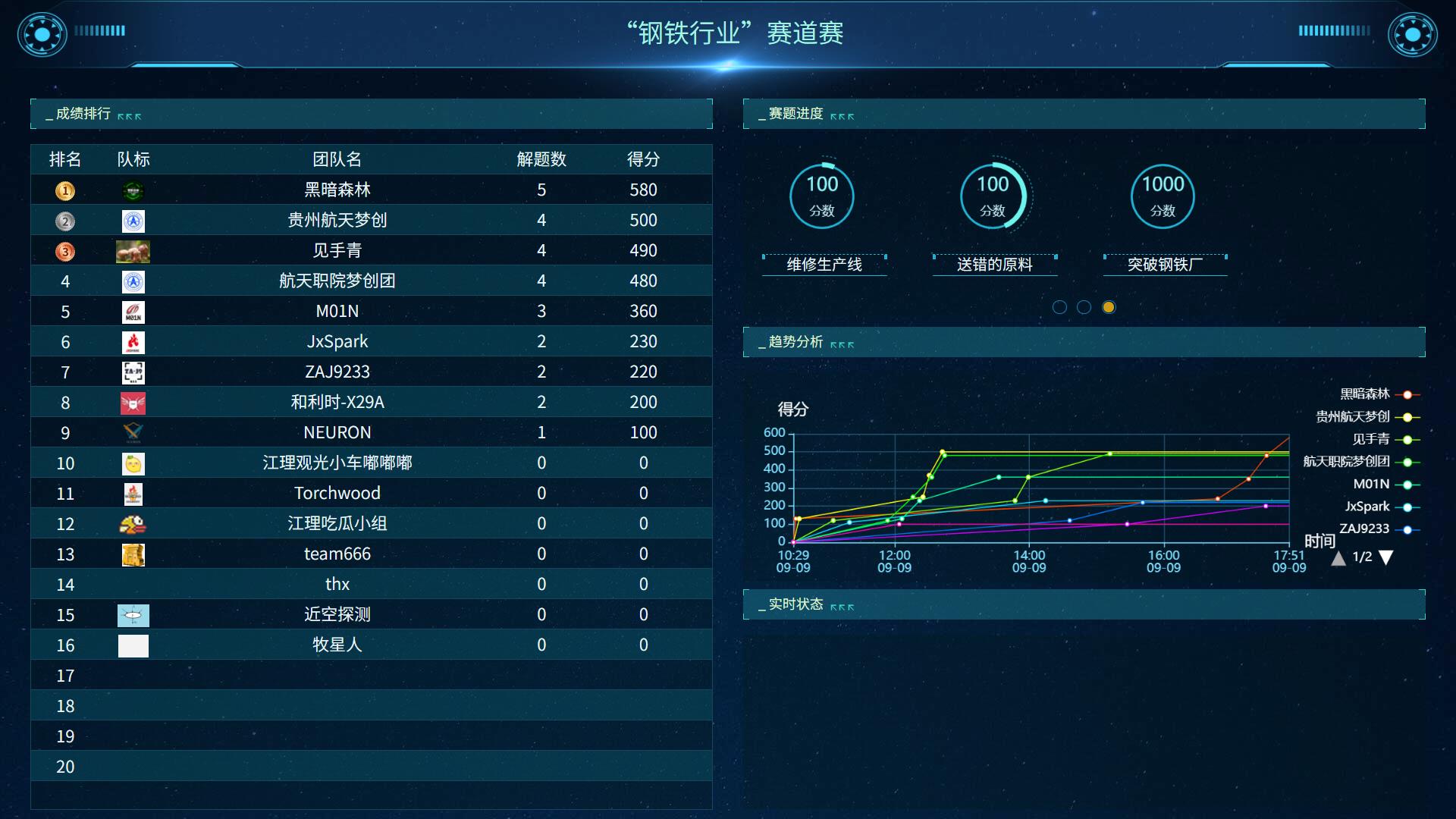 比赛推进到午时,近半数的队伍成绩都已经获得了分数积累!随即比赛也进入了胶着状态,“贵州航天梦创”战队、“航天职院梦创团”战队以及以微弱的分数差距争夺榜首位置,直至比赛临近结束前一小时左右,“黑暗森林”战队一路赶超,逆风翻盘夺下了榜首第一名!“贵州航天梦创”战队、“见手青”战队及“航天职院梦创团”战队分别位居第二名、第三名和第四名!
