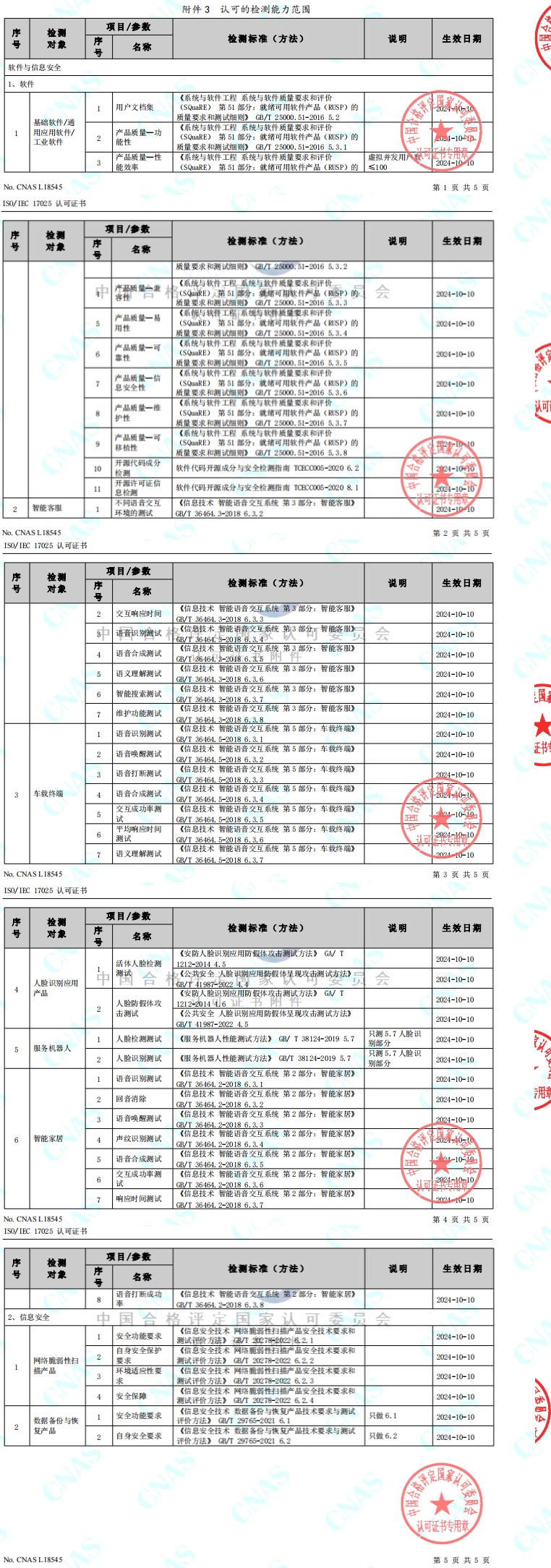 10月10日,中国合格评定国家认可委员会(CNAS)经认可评定,正式通知中心赛昇实验室通过评审。此次评审的顺利通过,是对中心赛昇实验室能力和质量管理水平的充分认可。本次实验室扩项认可,涉及软件及信息安全领域。赛昇实验室的检测能力范围由原有11个参数项,增至43个参数项。此次新增软件领域26个参数项:智能客服7项、车载终端7项、人脸识别应用产品2项、服务机器人2项、智能家居8项;新增信息安全领域6个参数项:网络脆弱性扫描产品4项(共72个细项)、数据备份与恢复产品2项(共32个细项),共计新增32个参数项。(赛昇实验室认可的检测能力范围详见文末图片)