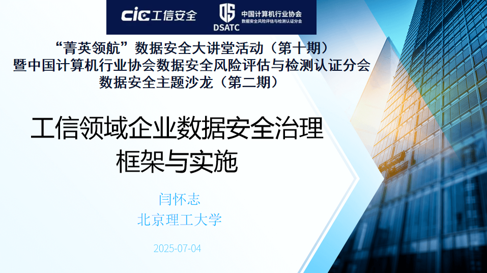 7月4日,工业领域数据保护与安全测评工业和信息化部重点实验室联合中国计算机行业协会数据安全风险评估与检测认证分会成功组织举办“菁英领航”数据安全大讲堂活动(第十期)。本次活动以“企业数据安全治理实践”为主题,来自行业数据处理者、数据安全从业人员等830余人在线参与。活动特邀北京理工大学计算机学院网络攻防对抗技术研究所所长闫怀志、北京中安国发信息技术研究院院长张胜生、道可特律师事务所高级合伙人邓勇三位专家,围绕企业数据安全治理痛点,从治理框架、风险防范、企业出海合规实践等方面进行深度分享,并通过典型案例剖析治理难题,为企业提供可落地、可实操的解决方案,助力企业提升数据安全治理能力。本期活动回放见“工信安全瞭望”视频号。