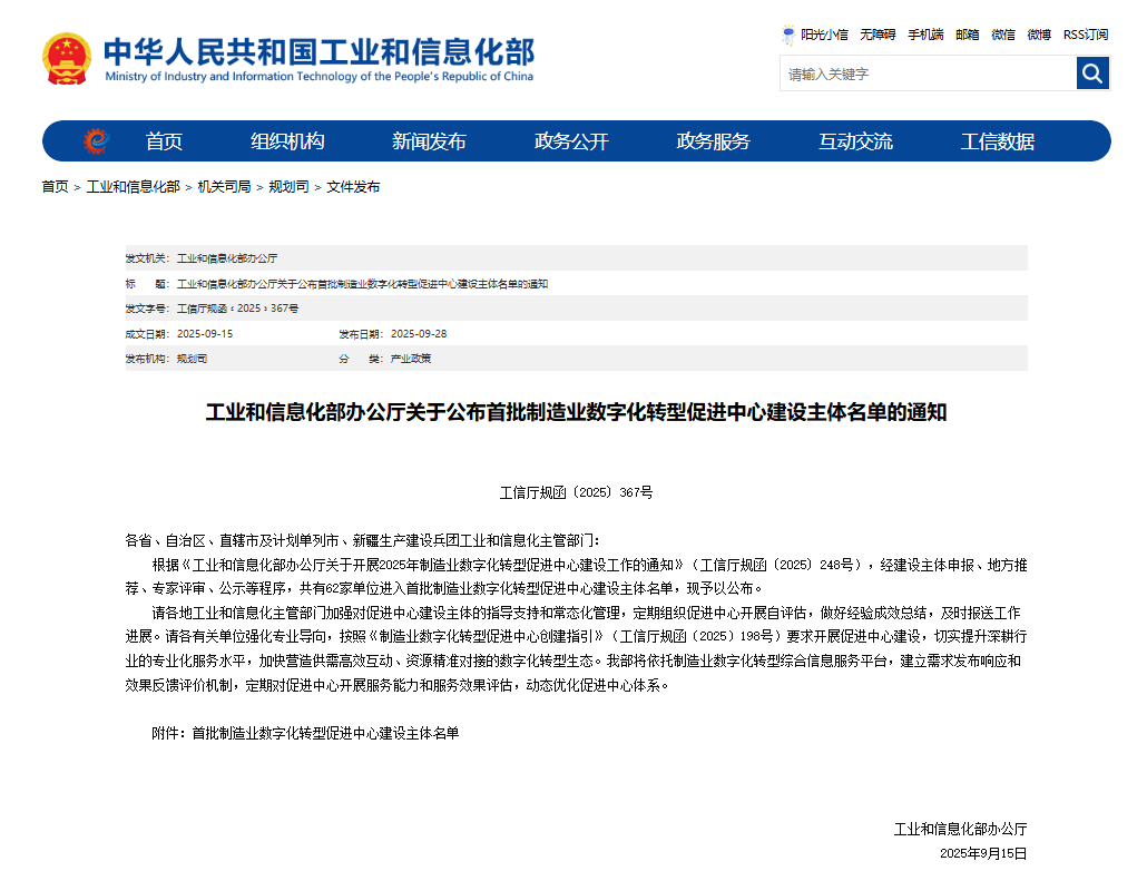 中心要闻 | 全国首批!我中心入选工信部制造业数字化转型 促进中心建设主体