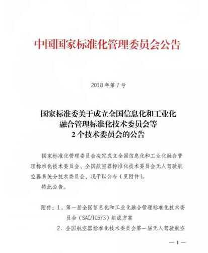 2018年6月14日,国家标准化管理委员会印发《关于成立全国信息化和工业化融合管理标准化技术委员会等2个技术委员会的公告》,决定成立全国信息化和工业化融合管理标准化技术委员会(以下简称“两化融合标委会”),编号为SAC/TC573,英文名称为National Technical Committee 573 on Integration of Informatization and Industrialization Management of Standardization Administration of China。