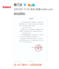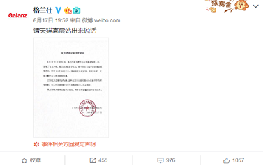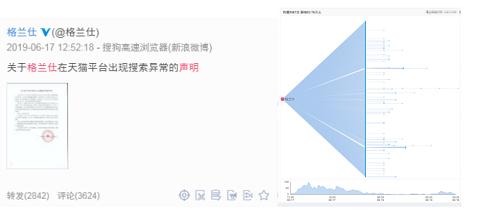 6月17日,格兰仕在官微发布《关于格兰仕在天猫平台出现搜索异常的声明》称,自今年5月28日格兰仕拜访拼多多以来,格兰仕在天猫平台的搜索端陆续出现异常,导致正常销售遭遇严重影响。发现异常后,格兰仕通过各种方式与天猫沟通,但异常问题至今未得到解决。该声明发布后迅速引发网络热议,相关微博在被转发2800余次,微博跟评3600余次,对微博网友的传播量达23.76万人。随后,财经网、北京商报、新浪网、搜狐网、腾讯网、IT之家、深蓝财经等媒体网站纷纷对该声明进行报道。