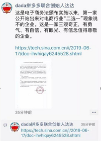 随后不久,拼多多的联合创始人达达在朋友圈转发了格兰仕的上述声明,并发表评论称:“这是电子商务法颁布实施以来,第一家公开站出来对电商行业‘二选一’现象说不的企业。这是一家三观奇正、有勇气、有自信、有眼光、有信念,值得尊敬的企业。”有舆论认为该条朋友圈证明在抨击天猫“二选一”问题上,拼多多已与格力站在了同一阵营。随后,《格兰仕倒在城乡结合部》《格兰仕喊“二选一”,是在演拼多多的剧本》《格兰仕所谓2选1就是拼多多设下的圈套》《格兰仕“反抗天猫”的背后是拼多多优势的体现》《格兰仕撕天猫:送给拼多多的嫁妆?》等评论性文章陆续出现。