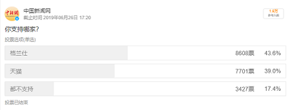 中国新闻网就此事件发起投票,引发大量网民参与。有1.9万名网民参与的投票结果显示,43.6%的网民支持格兰仕,39%的网民投票支持天猫,17%的网民持中立态度,谁都不支持。