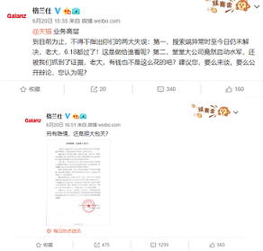 6月19日上午,格兰仕在其官微发布图片“格兰仕天猫搜索异常事件”,下午14时,又发布格兰仕店铺“618”期间店铺销量遭遇大面积下跌,对天猫的“打压”进一步进行举证。随后,格兰仕再连发三篇公开声明,分别题为《请加入正义的一方》《正告水军》《请天猫高层听听真实的声音》,在继续呼吁天猫管理层出面对话的同时,格兰仕在《请天猫高层听听真实的声音》一文中还提及,决定在微信上建一个专门的群,“一是对外发布消息,二是听取各方意见,三是聚焦遭遇与格兰仕有同样不公平待遇的商家。”