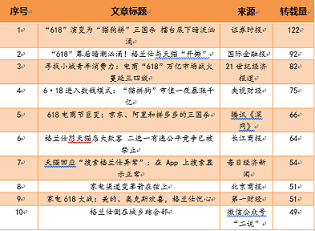 通过分析事件的热门文章报道可知,来源于证券时报的《“618”演变为“猫狗拼”三国杀 擂台底下暗流汹涌》传播次数达到122次,位居第一。该文章聚焦“618”期间电商行业竞争状况,直指“618”成为天猫、京东、拼多多三大电商巨头抢夺客户和订单的竞技场,格兰仕发布声明硬怼天猫是电商平台竞争白热化的折射。此外,《天猫回应“搜索格兰仕异常”:在App上搜索显示正常》等文章则对该事件的进展情况进行梳理,并将矛头指向电商“二选一”规则,指出尽管今年1月份的《电商法》对电商平台“二选一”问题作了规范,但“一些软性的手段依然处于灰色地带”。