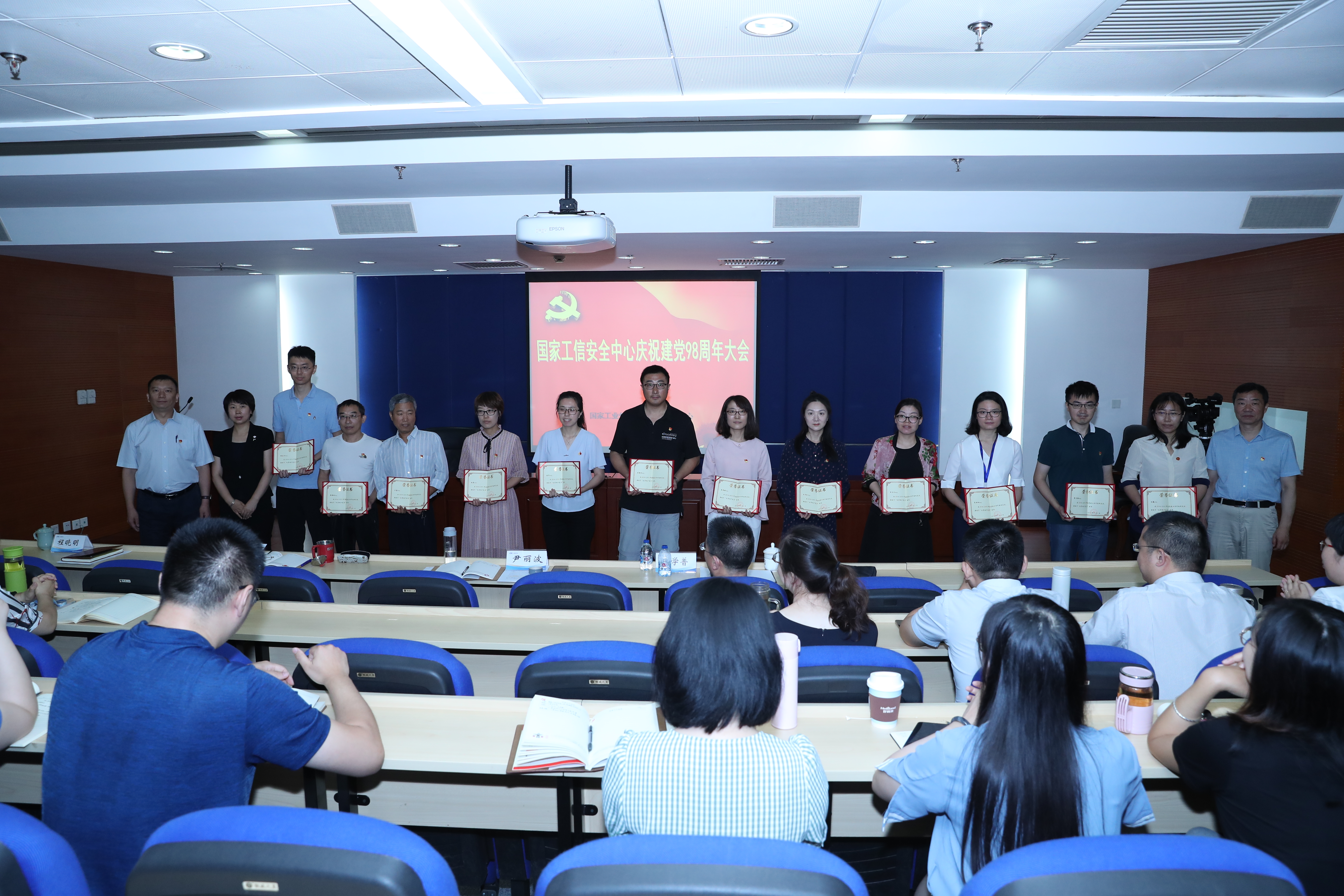中心党委委员、副主任李新社同志宣读了《关于表彰2018-2019年度优秀共产党员、优秀党务工作者和先进党支部的决定》,对25名优秀共产党员、14名党务工作者和5个先进党支部进行了表彰。会议强调,中心广大党员干部要以身边典型为榜样,不断深入学习贯彻落实习近平新时代中国特色社会主义思想和党的十九大精神,牢固树立“四个意识”、坚定“四个自信”,坚决做到“两个维护”,围绕中心,服务大局,扎实做好“不忘初心、牢记使命”主题教育各项工作,为建设国家工信安全中心、打造工业信息安全核心竞争力做出新的更大贡献。