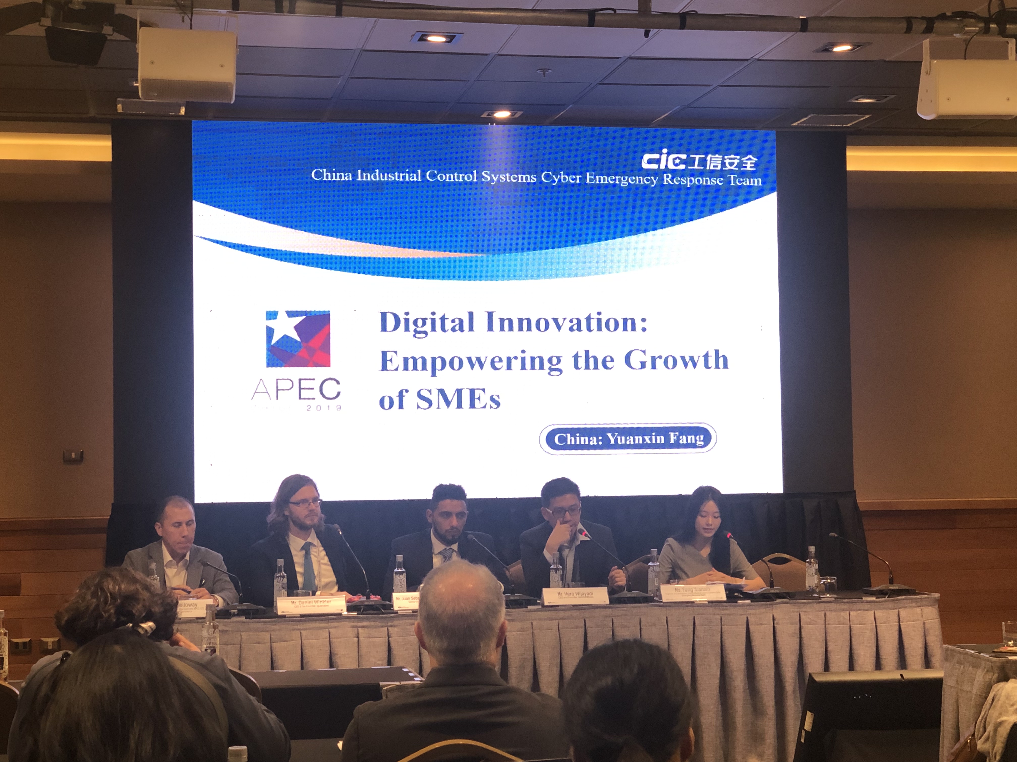 2019年8月,亚太经合组织(APEC)第三次高官会系列会议在智利巴拉斯港举行。我中心信息政策所方元欣参加了数字贸易政策对话会,并发表题为《Digital Innovation:Empowering SMEs’Growth》(数字创新:赋能中小企业发展)的主旨演讲,分享了我国中小企业利用数字技术实现转型发展的案例和实践。本次数字贸易政策对话会由智利与美国联合主办,主要围绕“增加对数字贸易的参与”、“创造有利于数字平台发展的监管环境”、“分享中小型企业的数字化实践”和“企业对数据的使用”四个议题展开,参会人员包括APEC经济体的政府官员、智库专家与企业代表,出席嘉宾包括智利议员Hon. Kenneth Pugh、美国商务部东亚和APEC办公室副主任Eric Holloway、APEC国家中心执行副主席Alex Parle、新加坡电信咨询公司TRPC负责人Peter Lovelock、以及信息技术与创新基金会、亚洲贸易中心、沃尔玛、美国联邦快递等行业代表等。