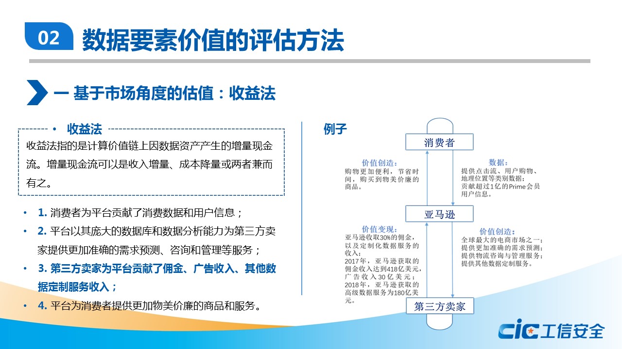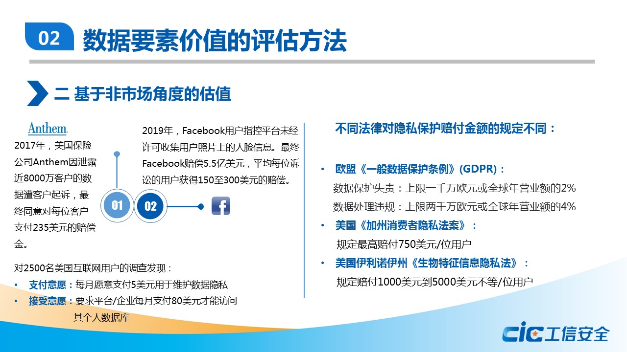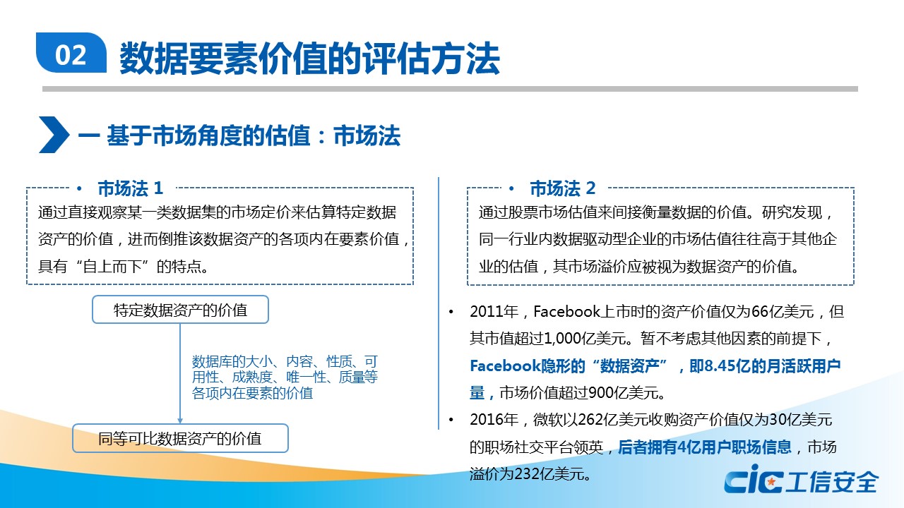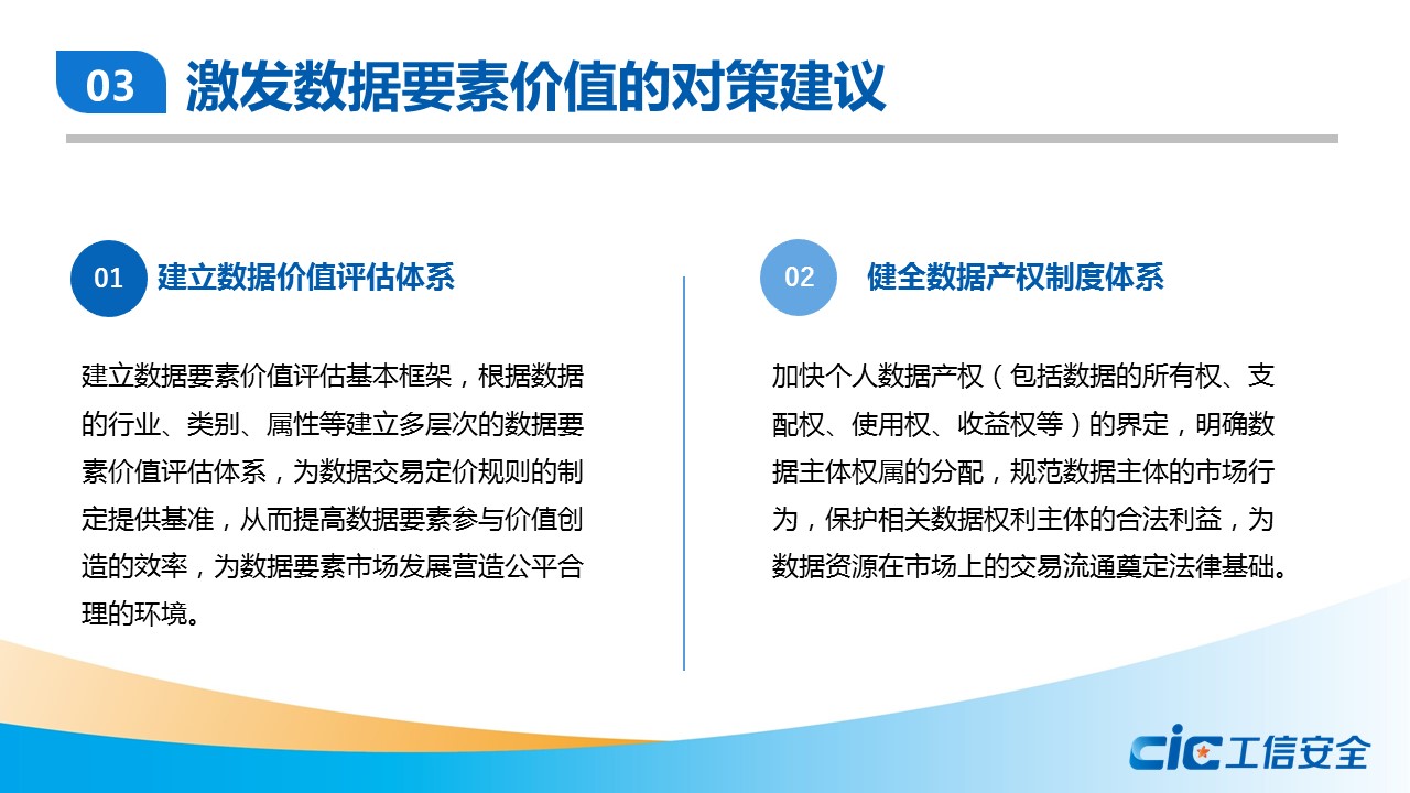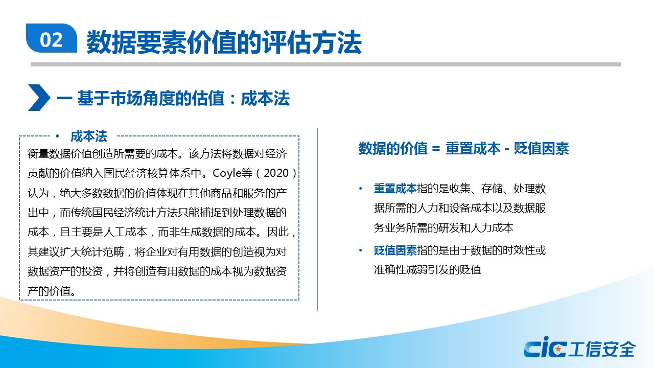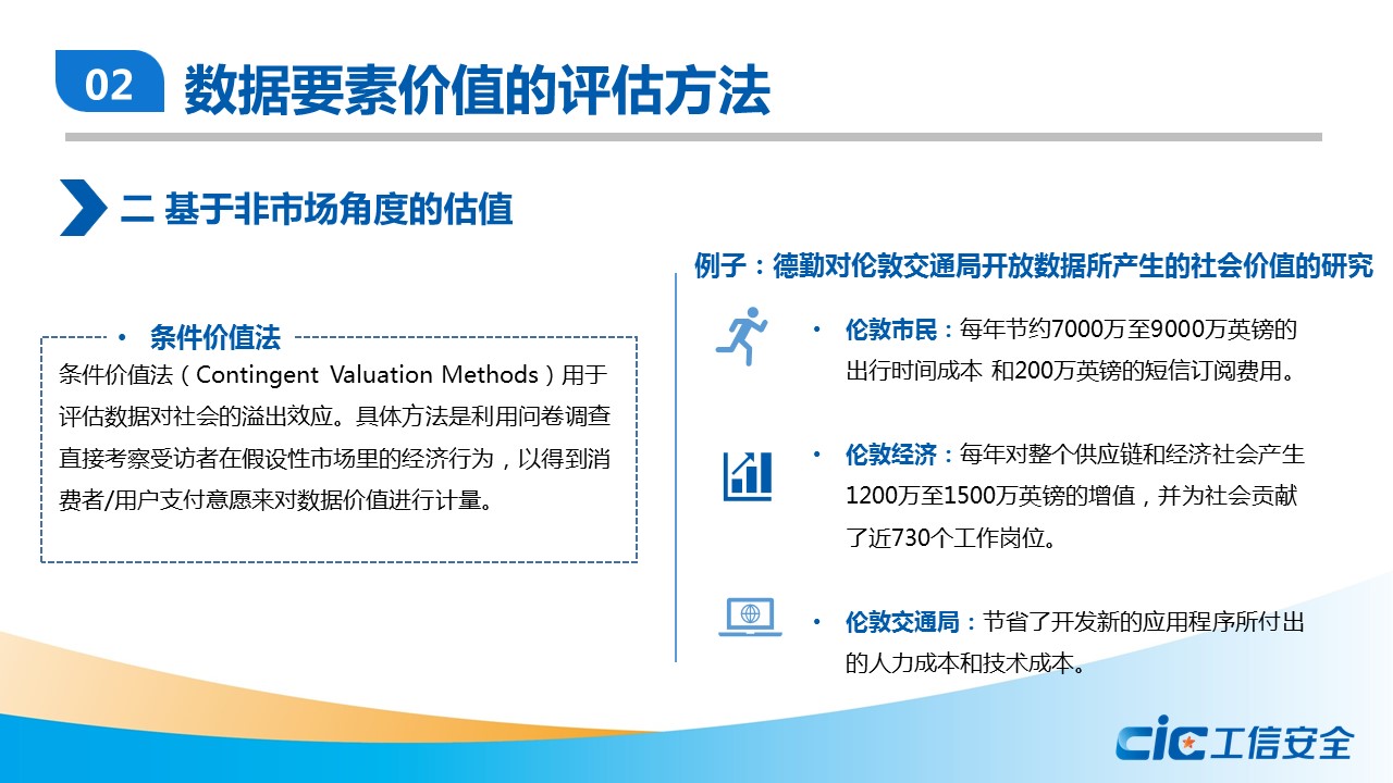报告强调,目前国内外对数据要素价值的评估仍处于探索阶段。从市场角度来看,可通过三种方法评估数据价值:一是市场法,即衡量数据资产的市场交易价格或数据密集型企业的市场溢价。二是收益法,即计算数据价值链上因数据资产产生的增量现金流。三是成本法,即将提取数据价值的成本视为数据资产的价值。从非市场角度来看,可通过条件价值法,即通过调查公民对数据开放共享和隐私保护的价值判断来衡量数据的社会价值。
