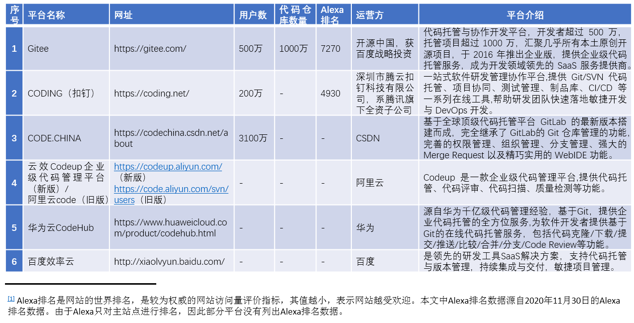 一类是基于Git的代码托管与研发协作平台,主要面向企业、开发者、公众等提供代码托管与下载、软件开发协作等服务,典型代表是Gitee和CODE.CHINA。其中,Gitee作为综合性的代码托管平台,拥有超过500万开发者及15万企业用户,托管代码仓库数量超过1000万,镜像了近2万个来自国际代码托管平台上的开源代码仓库,供用户高速下载,在国内开发者中受到欢迎。CODE.CHINA作为“后起之秀”,于2020年9月由CSDN推出,基于全球顶级代码托管平台 GitLab 的最新版本搭建而成,重点托管新兴技术领域(如IoT、AI、5G、区块链等)的开源项目。