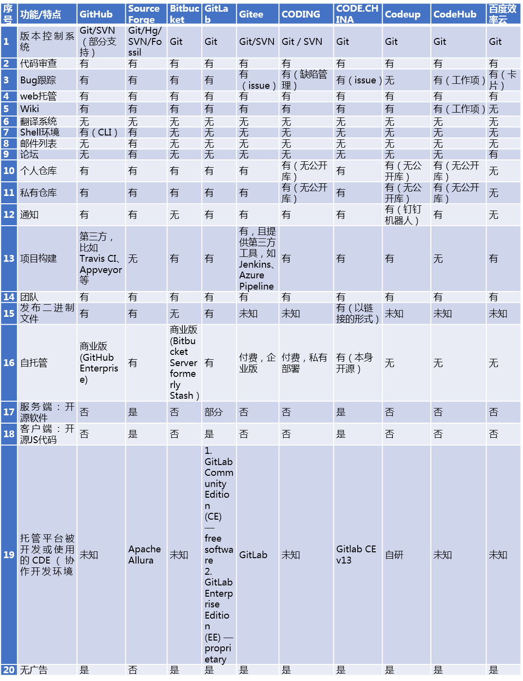 代码托管平台的功能和性能关乎用户体验,直接影响用户量和托管的代码仓库的数量。代码托管和社区协作是代码托管平台提供的两大主要服务,国家工信安全中心根据上述两种服务的功能,从版本控制系统、代码审查、Bug跟踪、web托管、Wiki、翻译系统、Shell环境、邮件列表、论坛、个人仓库、私有仓库、通知等20个功能和特点入手,将国内外代码托管平台进行对比分析(详见表3)。