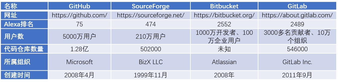 目前,国外知名的代码托管平台有GitHub、SourceForge、Bitbucket、GitLab等(详见表2),其中,GitHub是全球最大的代码托管平台,用户数达5000万,代码仓库数量超过1亿,汇聚了全球主要开源项目及代码资源。我国许多开发者和企业使用GitHub,用户数仅次于美国、位居全球第二。从Alexa排名、用户量、代码仓库数量等方面对比分析发现,我国平台整体上与国外相比还存在较大差距。