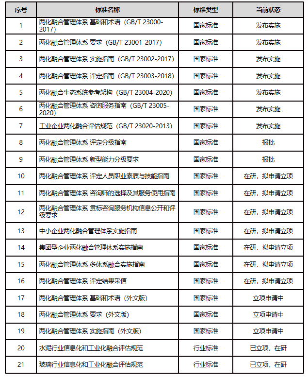 全国信息化和工业化融合管理标准化技术委员会两化融合管理体系标准工作组(TC573/WG1)重点负责两化融合管理体系相关标准的研究、制定修订、测试验证、宣贯推广和国际标准化工作。目前归口推动的标准项目如下表所示。