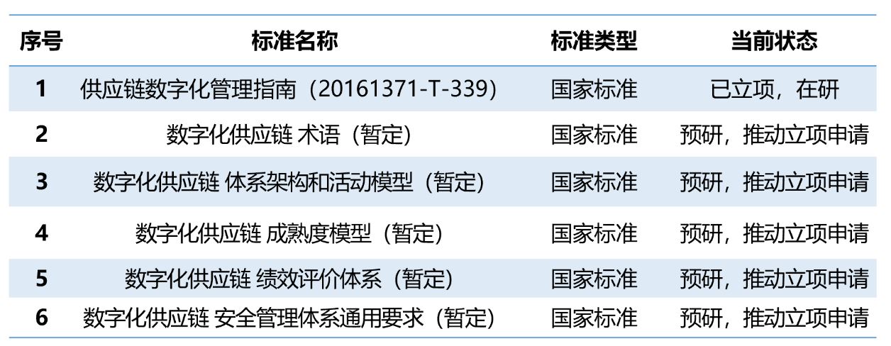 全国信息化和工业化融合管理标准化技术委员会现代供应链标准工作组(TC573/WG11)主要聚焦引导企业创新数字化条件下的供应链管控模式,开展数字化供应链领域标准化研究、关键标准制修订、标准宣贯推广和国际标准化等工作。目前归口推动的标准项目如下表所示。