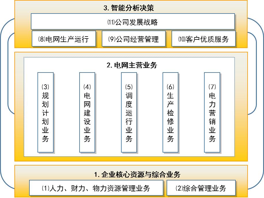 主要包括企业核心资源与综合业务、电网主营业务和智能决策分析3大板块,涉及11项业务应用。在此基础之上,参照“五位一体”协同机制,以业务流程为主线,从管理和信息化两个维度来审视管理与信息化之间的融合。