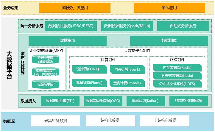 通过打造企业数据平台,提供数据接入、数据存储、数据计算能力,为数据接口服务、数据分析挖掘提供支撑服务。按照贴源层、明细层、分析共享层构建企业数据仓库,实现数据全量汇聚、标准存储和分析共享。部署大数据平台组件,提供列式存储、流计算、内存计算等大数据存储计算能力,实现数据分布式存储和实时分析计算。