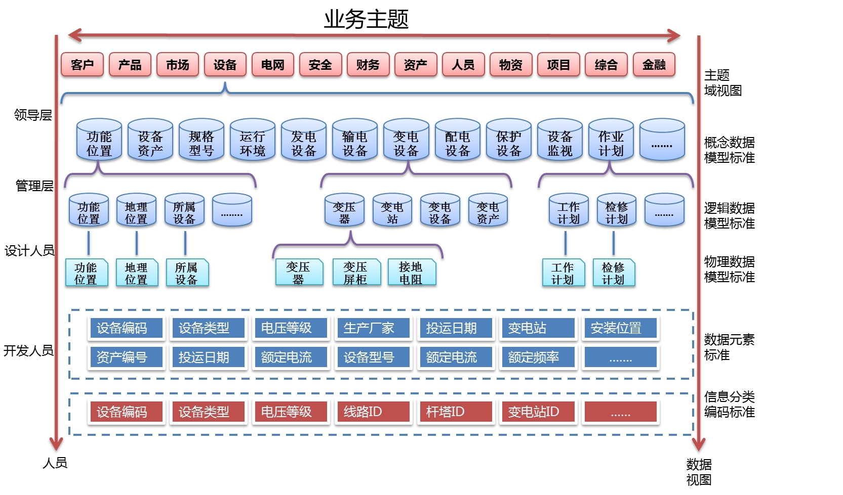 公司参照国家电网公司公共信息模型(SG-CIM)标准设计并构建了数据标准体系,包括13个一级数据主题域,73个概念主题域,分专业分条线设计各领域数据模型,按照设备、电网、安全、财务、资产、人员、客户、产品、市场、物资、项目、综合、金融十三个业务领域划分,从领导层、管理层、设计人员、开发人员等视角对数据的主题域视图、概念数据模型标准、逻辑数据模型标准、数据元素标准、信息分类编码标准等内容进行设计规划。