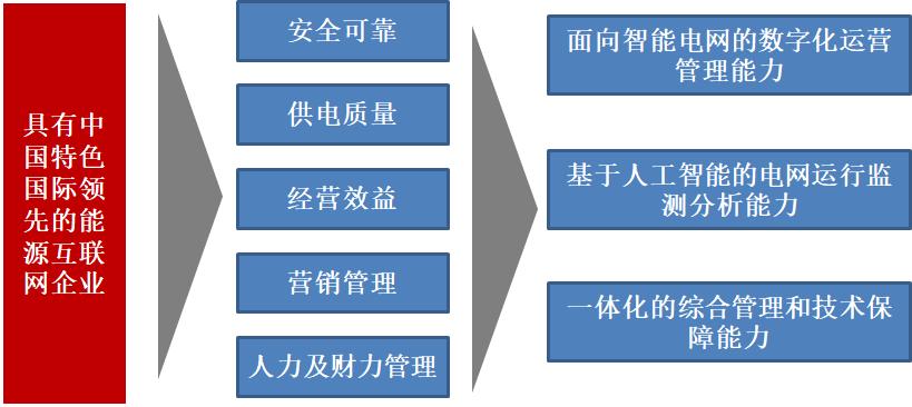 公司基于建设成为“具有中国特色国际领先的能源互联网企业”的战略导向,通过IFE分析法,明确了公司优势和劣势两个方面因素,充分发挥在电网基础设施建设和统筹规划方面的优势,识别出了需要获取的安全可靠、供电质量、经营效益、营销管理及人力及财力管理等方面的可持续竞争优势,打造基于全网状态感知和和人工智能的能源互联网控制管理能力,具体可分解为面向智能电网的数字化运营管理能力、基于人工智能的电网运行监测分析能力和一体化的综合管理和技术保障能力。
