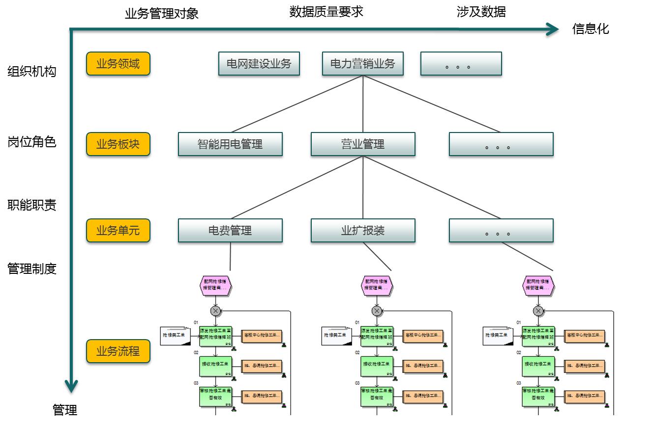 (1)梳理升级业务流程。优化业务流程是打造面向智能电网的数字化运营管理能力的重要环节。公司重点对智能电网、能源互联网生产运行等相关的电网调控运行、源荷接入、能源交易、电网建设、生产检修关键业务进行分析和优化,压缩流程节点,提升流程效率。分析数据来源的业务工作为优化业务流程奠定基础。以企业架构的方法对业务开展梳理,以便能系统地、本质地、概括地把握企业的总体功能结构,分析数据产生和应用的业务场景,为后续构建统一的数据模型及数据管理体系提供必要的指导和输入。梳理工作从业务领域划分入手,参照国家电网公司下发的《国家电网公司“三集五大”体系建设总体方案》中的按照“两级法人、三级管理”的总体架构,梳理公司各级职能,构建公司能力架构图。