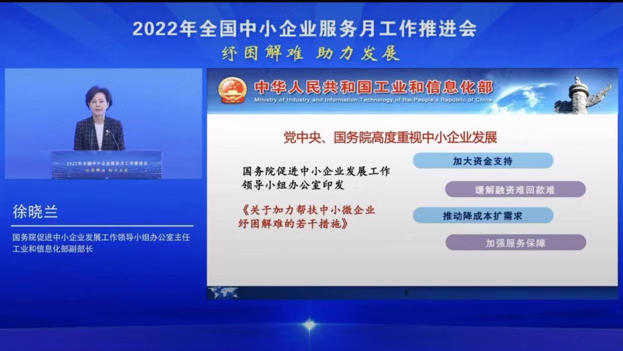 为深入贯彻落实党中央、国务院关于支持中小企业纾困解难健康发展的决策部署,5月10日,“2022年全国中小企业服务月”工作推进会在京召开,国务院促进中小企业发展工作领导小组办公室主任、工业和信息化部副部长徐晓兰出席工作会并讲话。国务院促进中小企业发展工作领导小组办公室副主任、工业和信息化部中小企业局局长梁志峰主持会议。