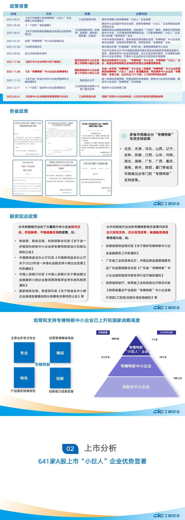 报告梳理了习近平总书记对专精特新中小企业的重要指示,以及上市小巨人企业发展所乘借的政策东风,分析了从中央到地方出台的一系列促进中小企业专精特新发展的政策、融资促进举措。在这些政策的扶持下,工业和信息化部目前已培育专精特新“小巨人”企业8997家。