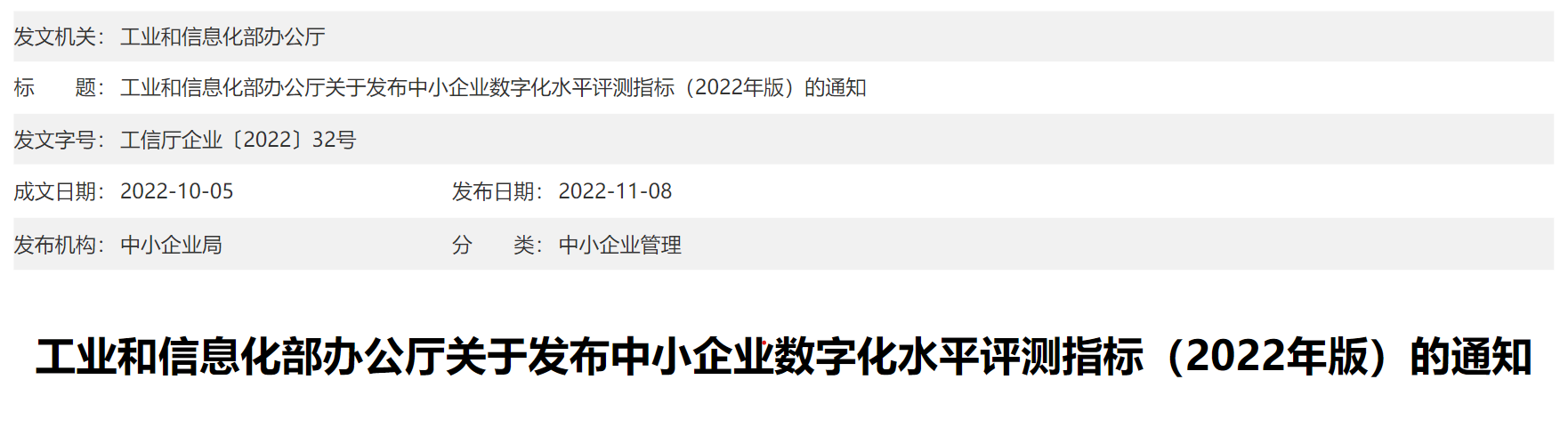 近日,工业和信息化部发布《中小企业数字化水平评测指标(2022年版)》(以下简称《评测指标》),《评测指标》根据行业特点,分为制造业数字化水平评测表、生产性服务业数字化水平评测表和其他行业数字化水平评测表三个类别,从数字化基础、经营、管理、成效四个维度综合评估中小企业数字化发展水平,依据企业评测得分,将数字化水平划分为四个等级。企业根据自身实际情况自愿自主填报,评测结果将作为《优质中小企业梯度培育管理暂行办法》“专精特新中小企业认定标准”第5个评价指标“数字化水平”的评价依据。