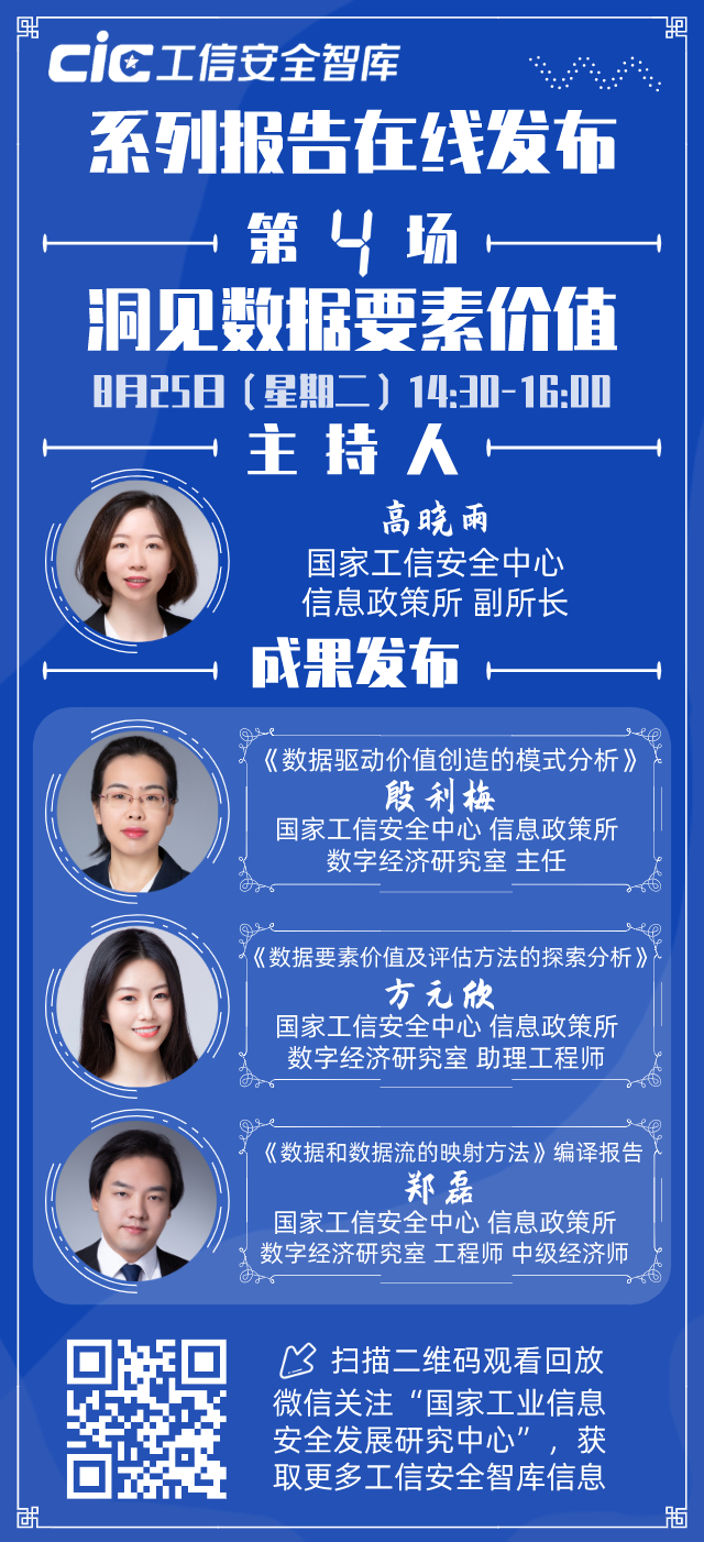 8月25日下午,“工信安全智库”系列线上发布活动第四场——“洞见数据要素价值”主题发布成功举办。本次活动由优米棋牌软件怎么样信息政策所副所长高晓雨主持。优米棋牌软件怎么样信息政策所数字经济研究室主任殷利梅,工程师方元欣、郑磊分别进行了研究成果分享。