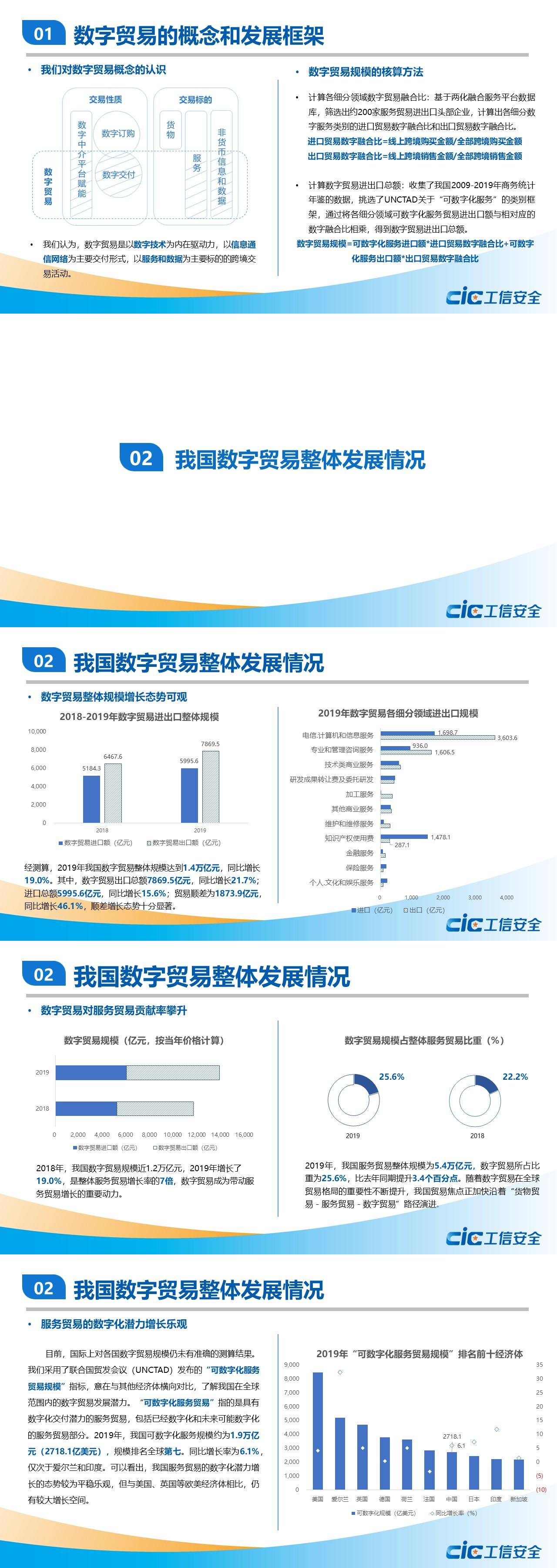 报告指出,目前我国数字贸易正步入高速发展新阶段。据测算,2019年,我国数字贸易进出口规模达到1.4万亿元,同比增长19.0%,占整体服务贸易比重达25.6%。贸易顺差约为1873.9亿元,同比增长46.1%。各细分领域呈现规模逐年扩大、贸易逆差不断收紧、新模式新业态不断涌现的良好发展势头。这主要得益于我国相对扎实的数字基础设施建设,不断提升的数字技术研发能力以及不断迸发的数字产业活力。