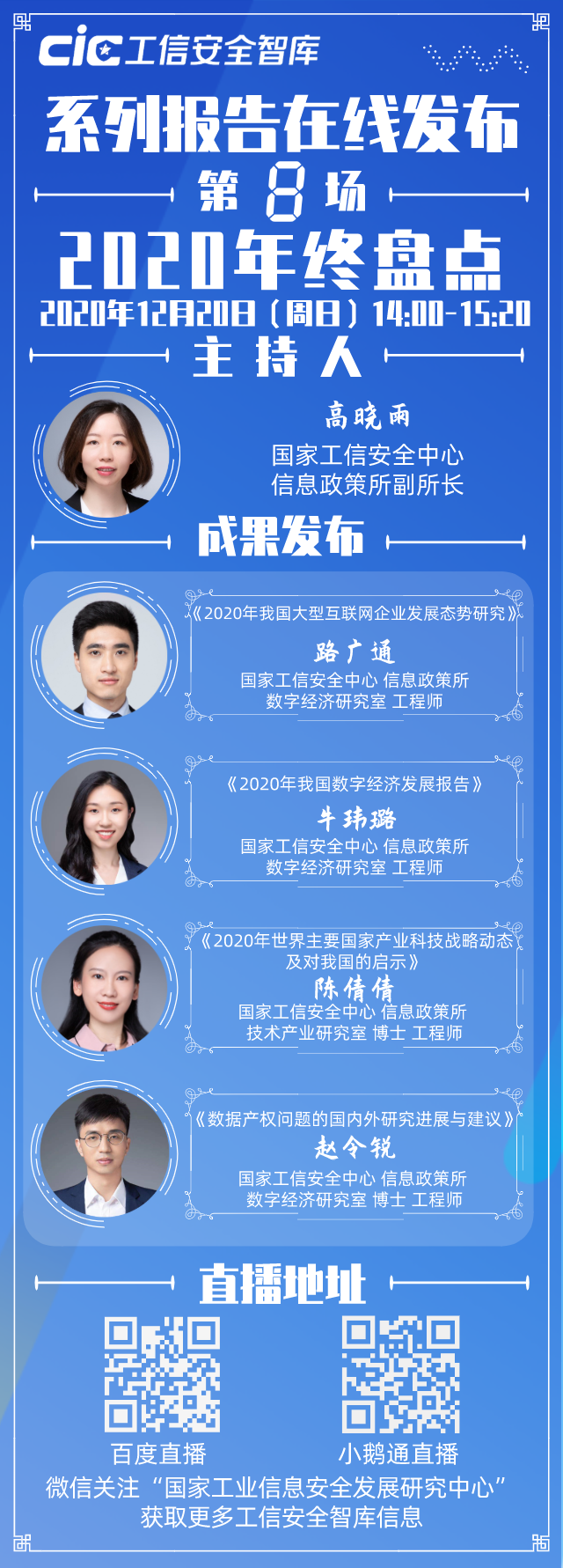 第八场“工信安全智库”系列报告在线发布活动将于本周日(12月20日)下午2:00准时上线。本次发布活动以“2020年终盘点”为主题,重点围绕大型互联网企业、数字经济、产业科技战略、数据产权等议题发布《2020年我国大型互联网企业发展态势研究》《2020年我国数字经济发展报告》《2020年世界主要国家产业科技战略动态及对我国的启示》《数据产权问题的国内外研究进展与建议》四份报告。发布活动将由中心信息政策所副所长高晓雨主持。敬请期待。