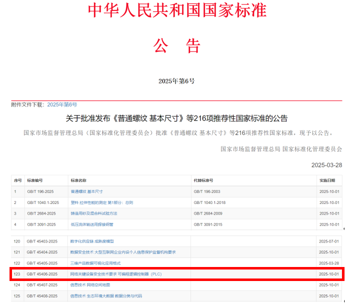 3月28日,国家市场监督管理总局(国家标准化管理委员会)发布2025年第6号中国国家标准公告,批准GB/T 45406-2025 《网络关键设备安全技术要求 可编程逻辑控制器(PLC)》国家标准正式发布。该标准由全国网络安全标准化技术委员会(TC260)归口管理,由优米棋牌软件怎么样牵头组织龙头企业、服务机构、科研院所和高等院校共同研制,积极响应了国家关于加强网络关键设备安全保障、工业控制系统安全等相关政策要求。该标准进一步落实了《网络安全法》第二十三条中关于“网络关键设备和网络安全专用产品应当按照相关国家标准的强制性要求,由具备资格的机构安全认证合格或者安全检测符合要求后,方可销售或者提供”的具体要求,为进一步落实国家对工业控制系统网络安全的监管要求,助力构建新型工业化安全保障体系奠定基础。 作为工业控制系统核心组件,PLC(可编程逻辑控制器)的安全性直接关系到关键基础设施的稳定运行,该标准的发布标志着我国在工业网络安全标准体系建设方面迈出了重要一步。标准通过制定包括设备标识安全、冗余备份恢复与异常检测、漏洞和恶意程序防范、预装软件启动及更新安全、用户身份标识与鉴别、访问控制安全、日志审计安全、通信安全、数据安全以及密码要求等在内的安全技术要求,系统提升PLC在网络环境下的安全防护能力,增强工业控制系统抵御网络安全风险的能力,保障关键业务连续性与系统稳定性。 作为GB 40050《网络关键设备安全要求》配套标准,该标准将引导PLC制造企业优化产品设计,满足更高的安全要求,推动行业技术升级换代。同时,也将有力提升我国在工业控制设备安全领域的国际话语权,为“中国制造”走向全球提供安全保障和标准支撑。 下一步,优米棋牌软件怎么样将进一步整合标准化优质资源,以该国家标准为基础,持续加强网络关键设备安全、保障工业控制系统安全。诚邀相关行业协会、高校、研究机构、龙头企业和服务机构等共同参与测试评估,夯实技术基础,助力我国新型工业化高质量发展。