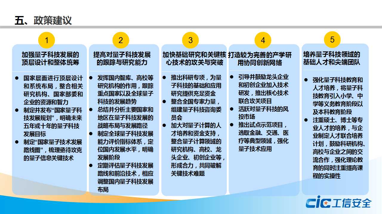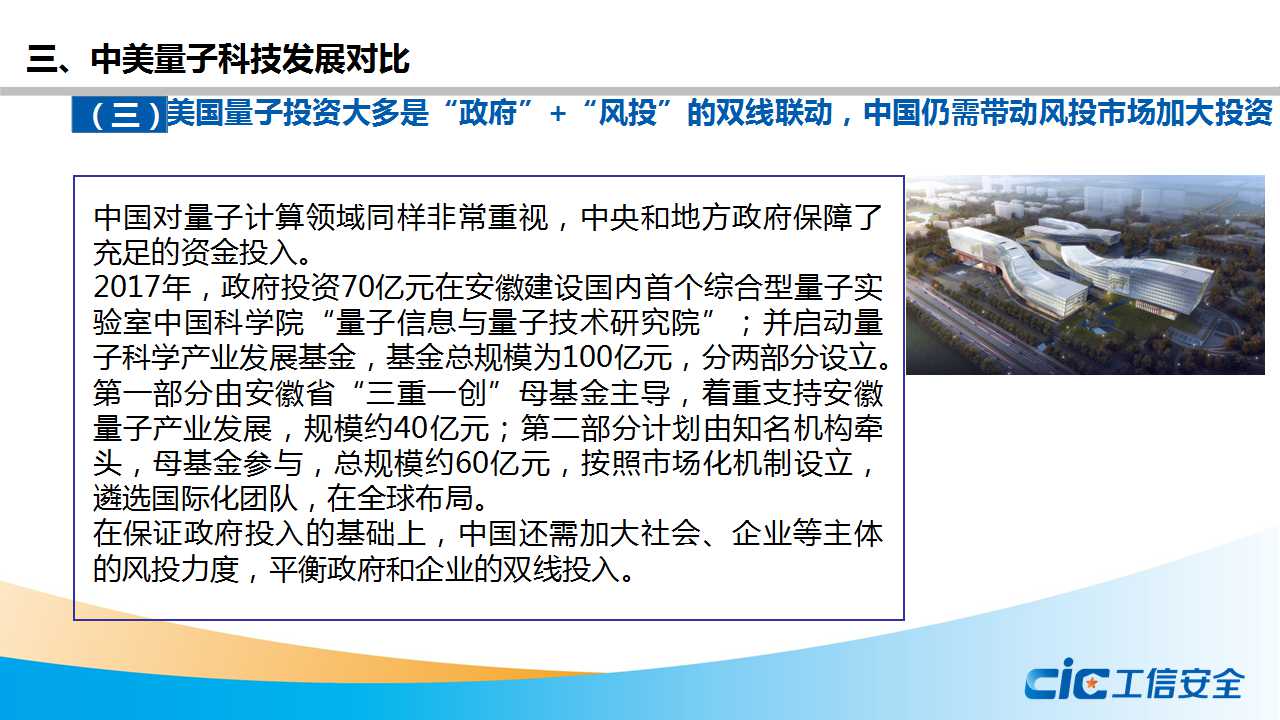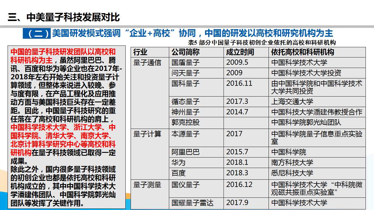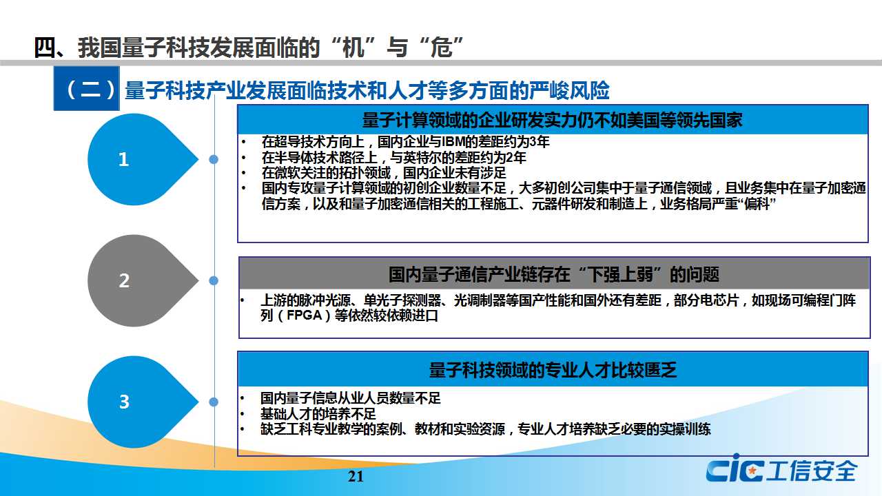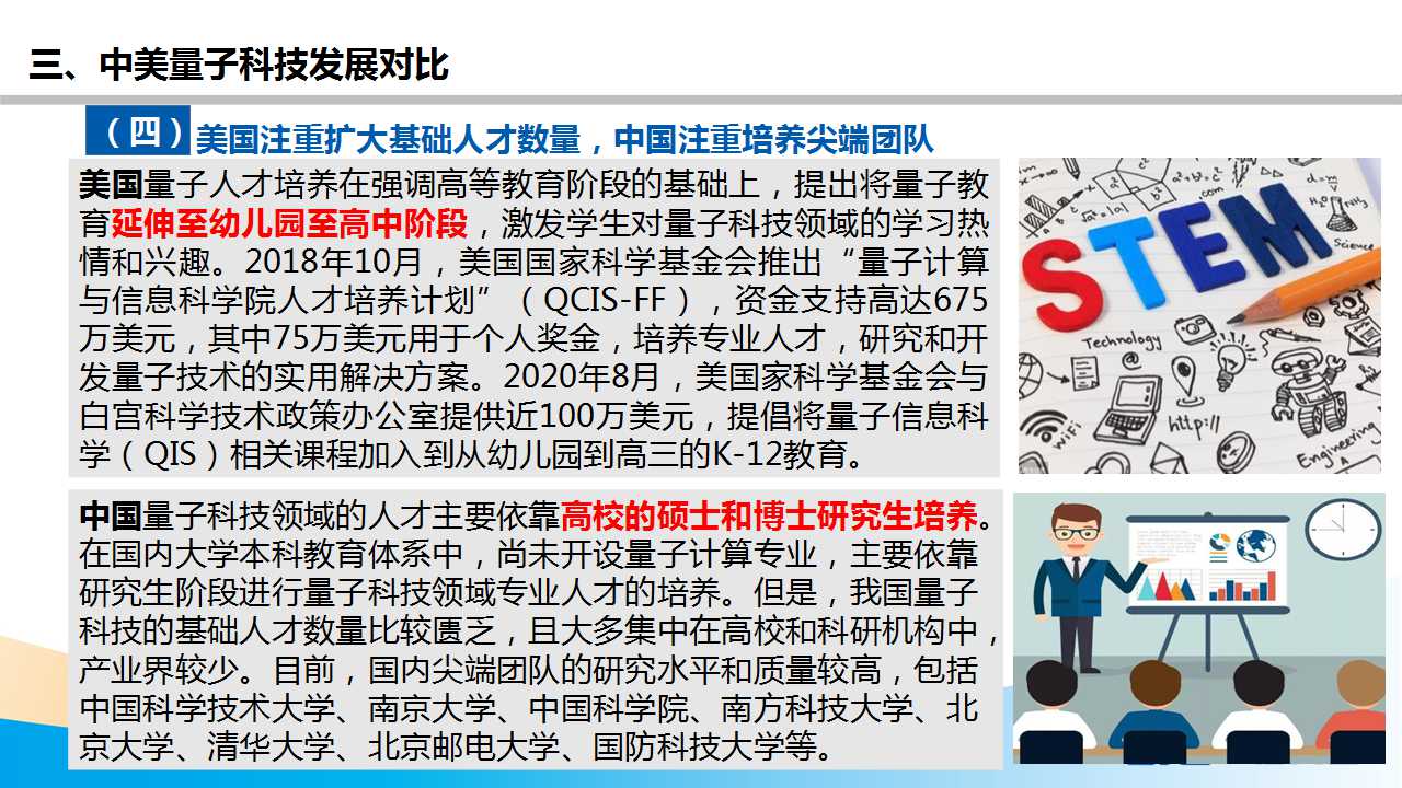 报告认为,我国与美国量子科技发展各有所长:美国在量子计算领域领先,中国在量子通信领域领先;美国研发模式强调“企业+高校”协同,中国的研发以高校和研究机构为主;美国量子投资大多是“政府”+“风投”的双线联动,中国仍需带动风投市场加大投资;美国注重扩大基础人才数量,中国注重培养尖端团队。报告指出,中国量子科技发展仍面临量子计算核心技术较落后、量子通信产业链上下游实力不均、量子科技人才数量不足等风险,亟须加强顶层设计和国家统筹,提高对量子科技发展的跟踪与研究,加快基础研究和关键核心技术的攻关,打造产学研用协同创新网络,培养量子科技领域的基础人才和尖端团队。
