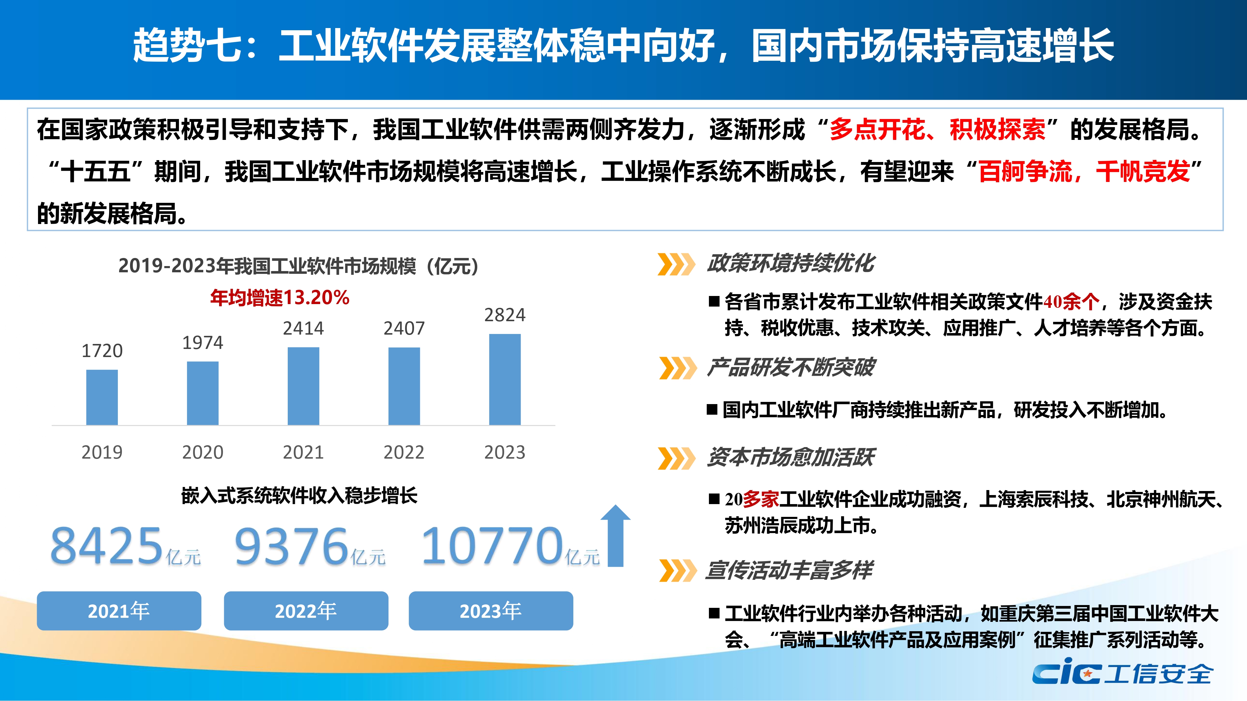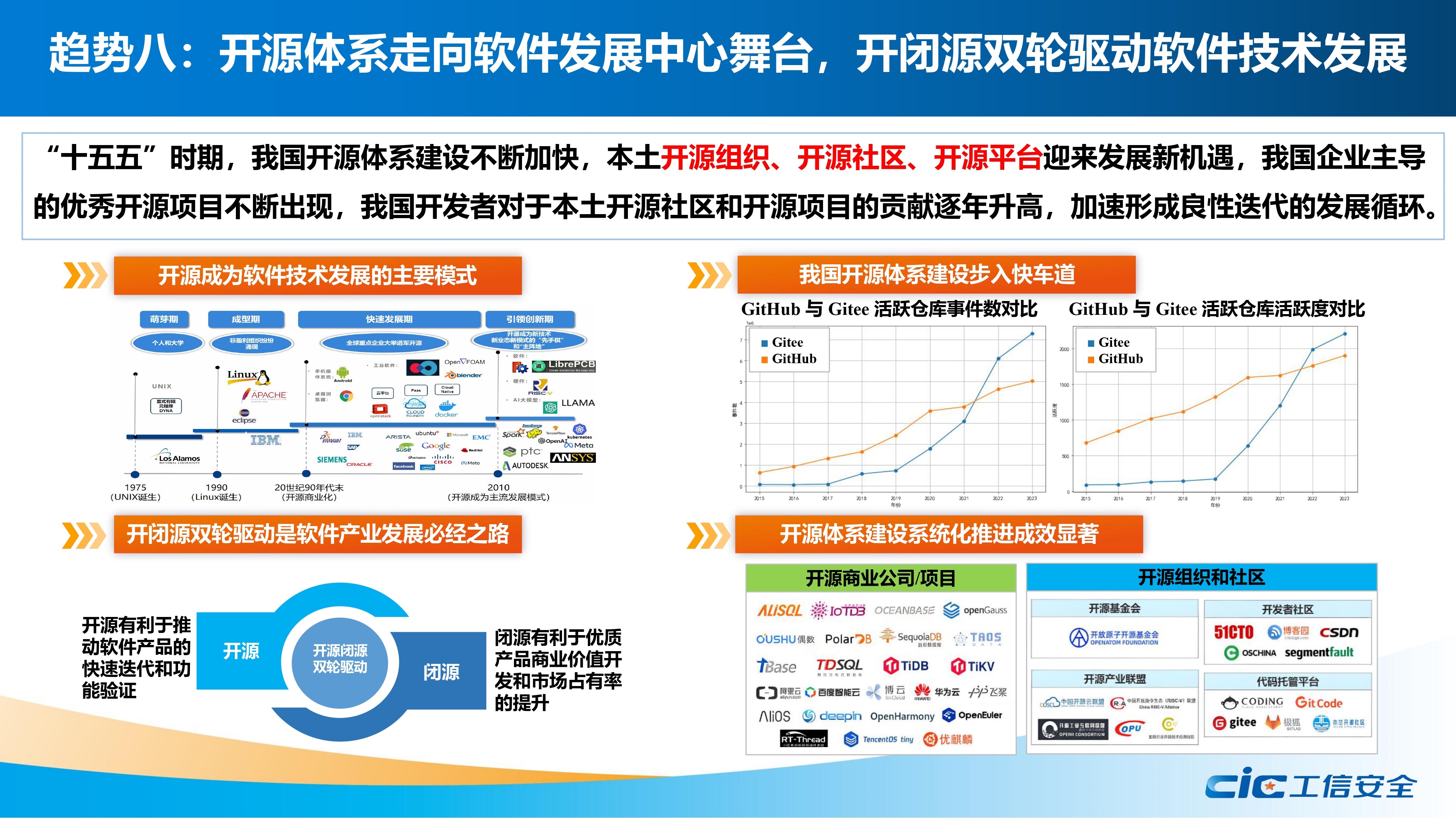 总体上看,在新型工业化需求拉动技术创新驱动双重作用下,我国软件产业将持续做大做强,人工智能带来重大发展机遇,云边协同等新兴技术应用走深走实,基础软件、工业软件等关键软件供给能力大幅提升,开闭源双轮驱动发展格局逐渐成为主流,软件供应链韧性和安全水平稳步提高,软件新质生产力加速形成,有力支撑数字经济高质量发展助力新型工业化伟大进程。