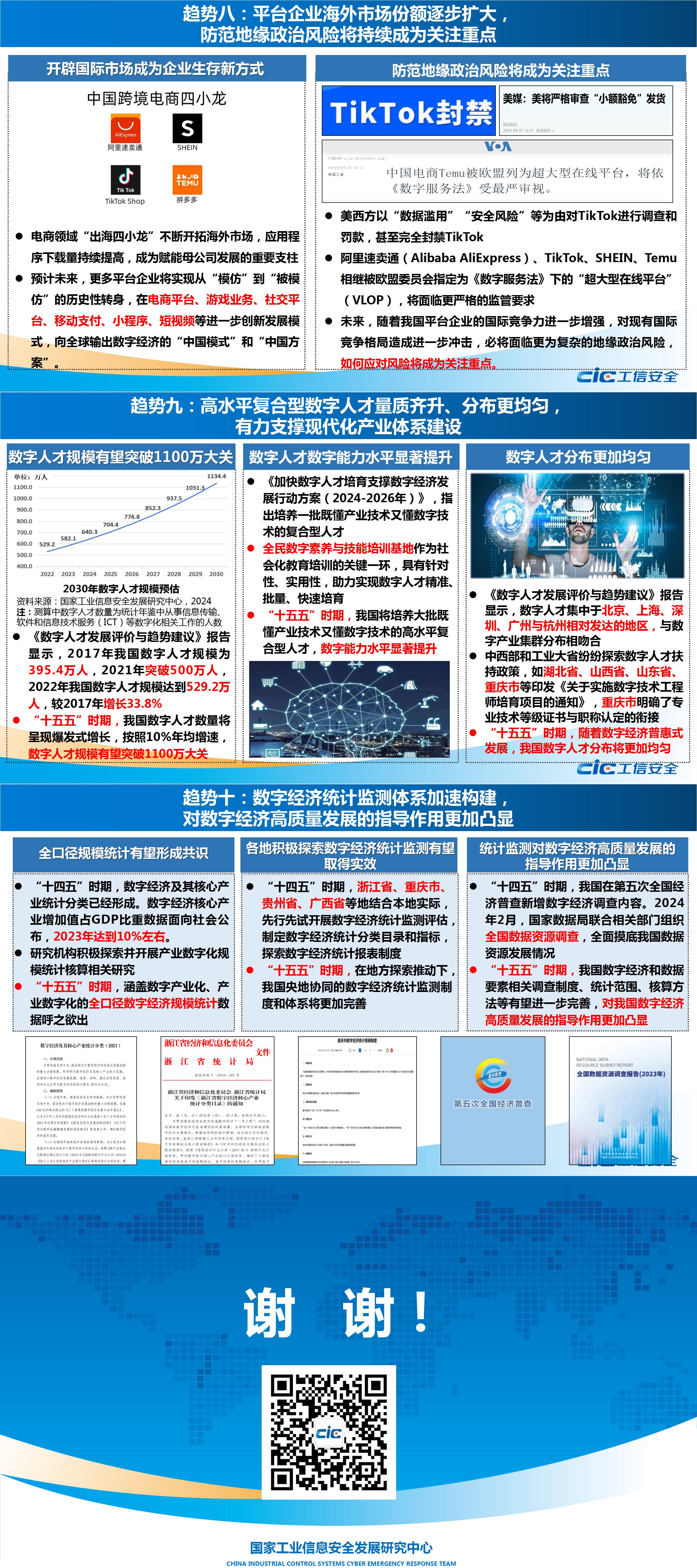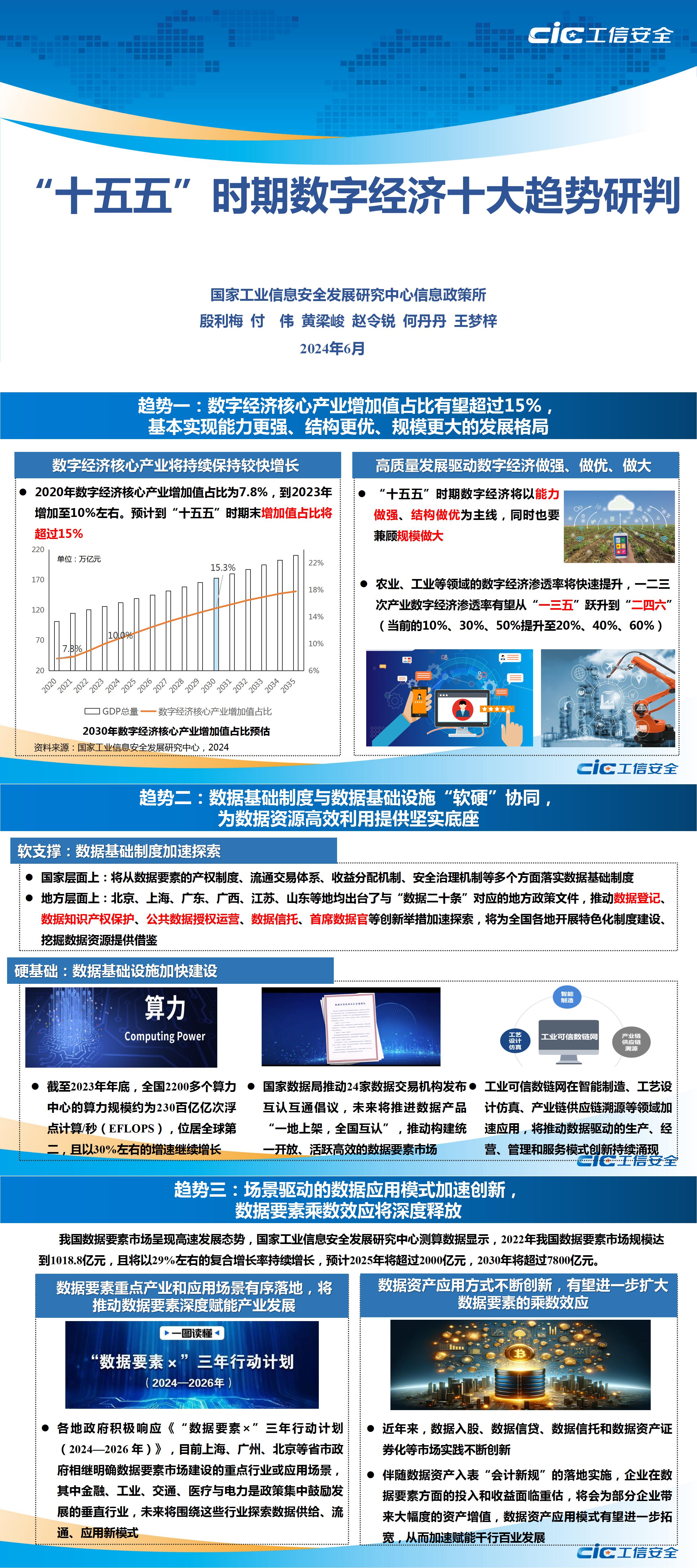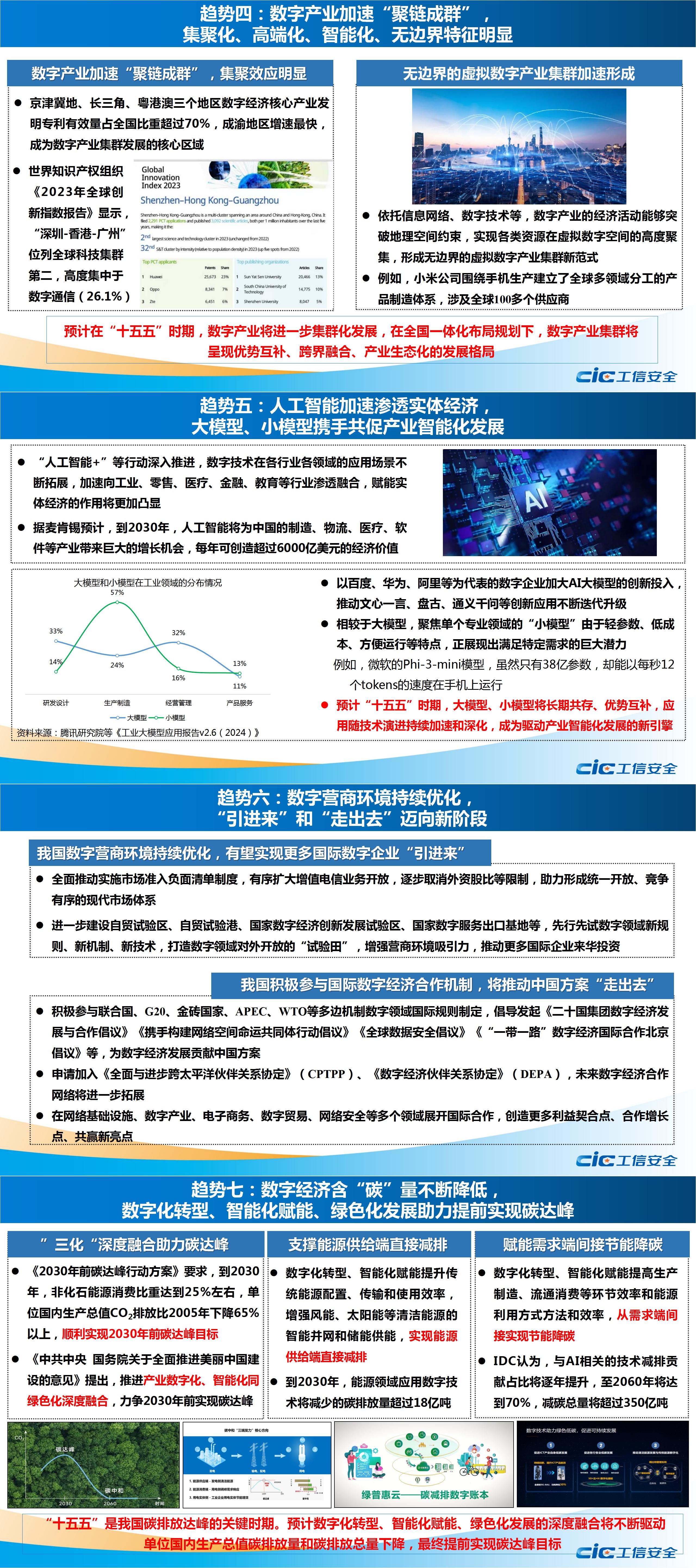 总体上看,“十五五”期间我国数字经济将保持较快发展,呈现出能力更强、结构更优、规模更大的发展格局和数字化转型、智能化升级、绿色化发展的发展趋势,数字营商环境持续优化,高水平复合型数字人才量质齐升,数字经济统计监测体系加速构建,将为发展新质生产力、推进新型工业化和建设现代产业体系提供广阔的市场空间、丰富的机会场景和优渥的创新土壤。