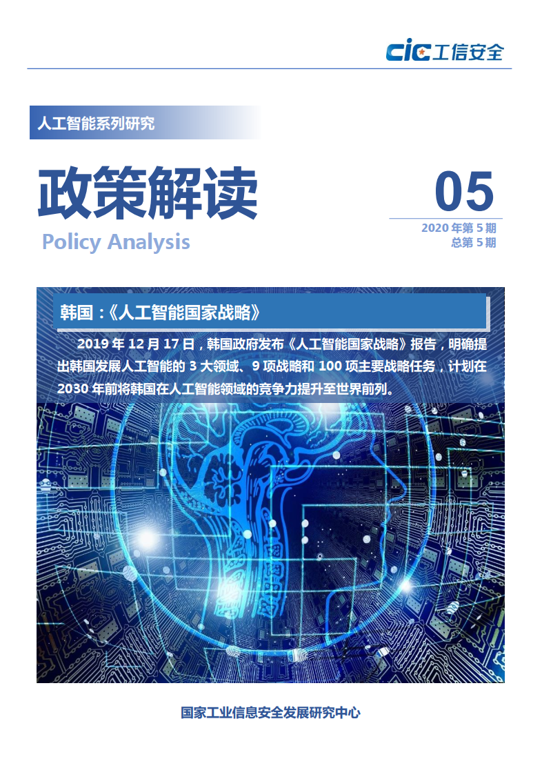 《政策解读》第5期将解读韩国2019年12月17日发布的《人工智能国家战略》。报告指出,在全球经济形势低迷、不确定性加剧的环境下,韩国有必要以人工智能国家战略为引领,提升国家在全球人工智能领域的竞争力,并实现提振经济社会活力,改善民众生活质量的目标。为此,报告以2030年为节点,明确提出了韩国发展人工智能的3大领域、9项战略和100项主要战略任务,以及配套实施推进方案。