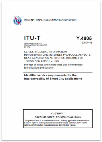 ITU-T Y.4805标准全称为《智慧城市应用的互操作性对标识服务的需求》[ 目前该标准是预发布阶段,正式标准中英文名称可能会有细微差异,可参考http://www.itu.int/ITU-T/recommendations/rec.aspx?rec=13267。],该项标准建议书[ Recommendation 国际电信联盟的标准,称为建议书。]规定了智慧城市应用中标识服务的一系列需求,以确保这些应用是可互操作和安全的。这些需求也可以作为智慧城市领域开发新标识服务的指导原则,包括服务完整性、数据保密性等安全特征。该标准建议书介绍了智慧城市应用互操作性的标识服务基本模型,包括服务模型、数据模型和操作模型。建议书重点是为标识服务定义一套包括安全需求在内的标识服务需求的完整列表,如通用需求(包括兼容性、可扩展性、解析效率、可扩充性、国际支持),通用安全需求(包括安全解析机制、自由的访问控制权限、分布式管理接口),服务模型相关需求(包括分布式服务模型、分布式根服务、可信任的根、副本和镜像、缓存服务、支持迭代和递归解析服务),数据模型相关需求(包括标识属性中访问控制的通用机制、支持凭证验证、支持自由管理和标识所有权、可扩展的数据模型、合适的命名机制),以及操作模型相关需求(包括安全操作、分布式环境下标识服务的协调运作、标识层级之间的信任)。