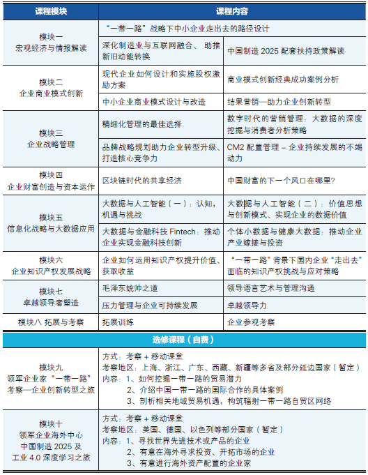 教学安排:学制1年(共20天,共计160学时),平均每月集中2-3天授课,并组织移动课堂、政企对接会、企业参访等活动。此外,根据学员需求,另行组织海外游学等活动。