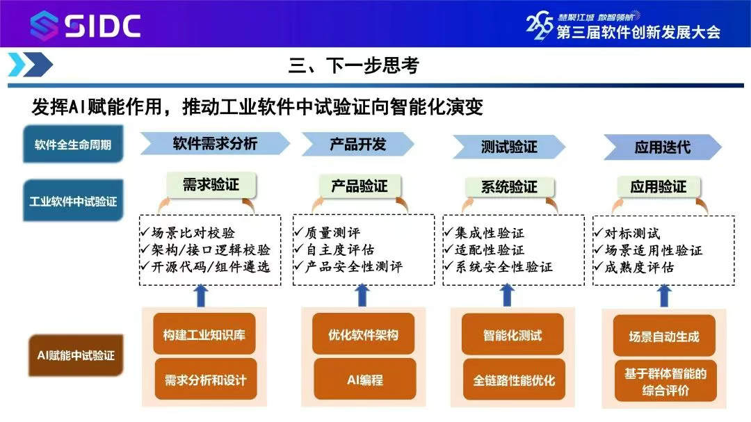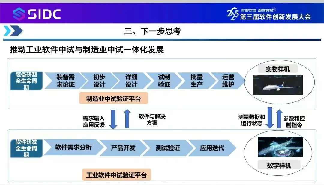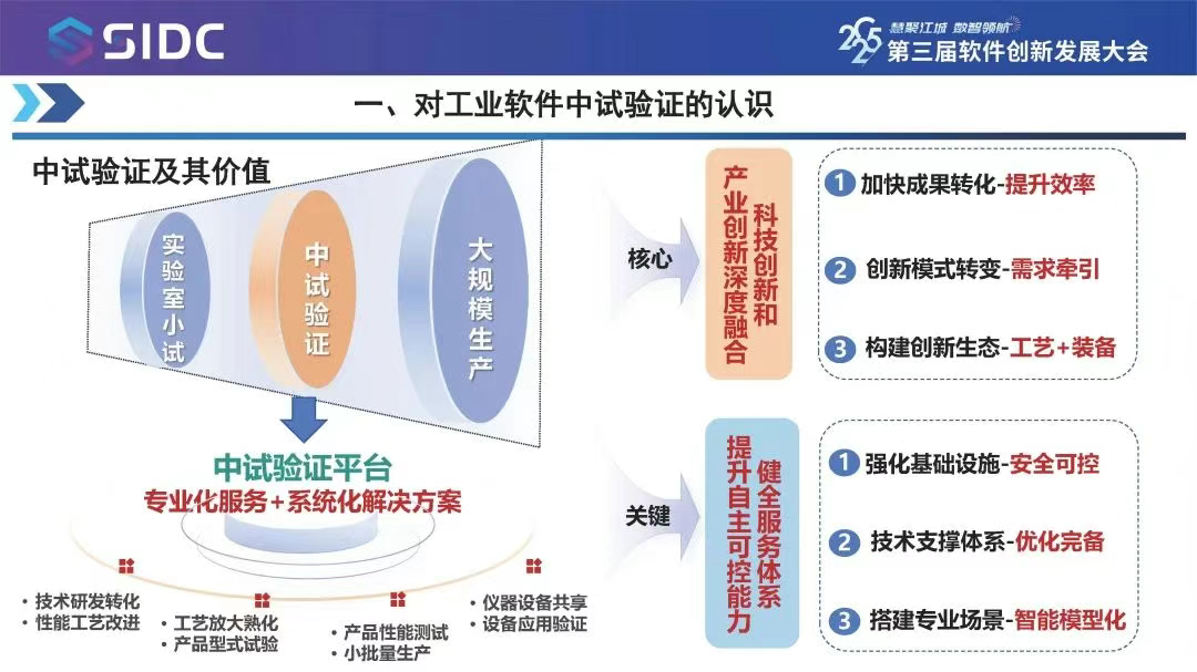 周平在主题发言中提出,党中央、国务院高度重视中试验证工作,中试验证平台是科技创新和产业创新深度融合的核心,是健全服务体系提升自主可控能力的关键。工业软件中试验证,是指通过真实的工业环境开展软件产品的应用验证,目的是确认工业软件的可用性、可靠性和安全性等水平。中心从单品质量测试积累工业软件专业知识、集成验证积累应用场景仿真经验、服务链主企业中找准中试验证切入点,以高端装备为背景开展国产工业软件的中试验证探索,面向7类高端装备的典型场景,形成了几十套满足局部应用需求的优选解决方案。未来,工业软件中试政策支持将不断走深向实,通过与AI等新兴技术的深度融合工业软件中试验证将向智能化方向不断演变,同时工业软件中试将与制造业中试一体化发展。
