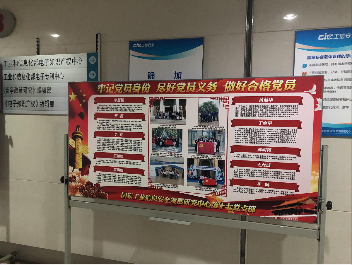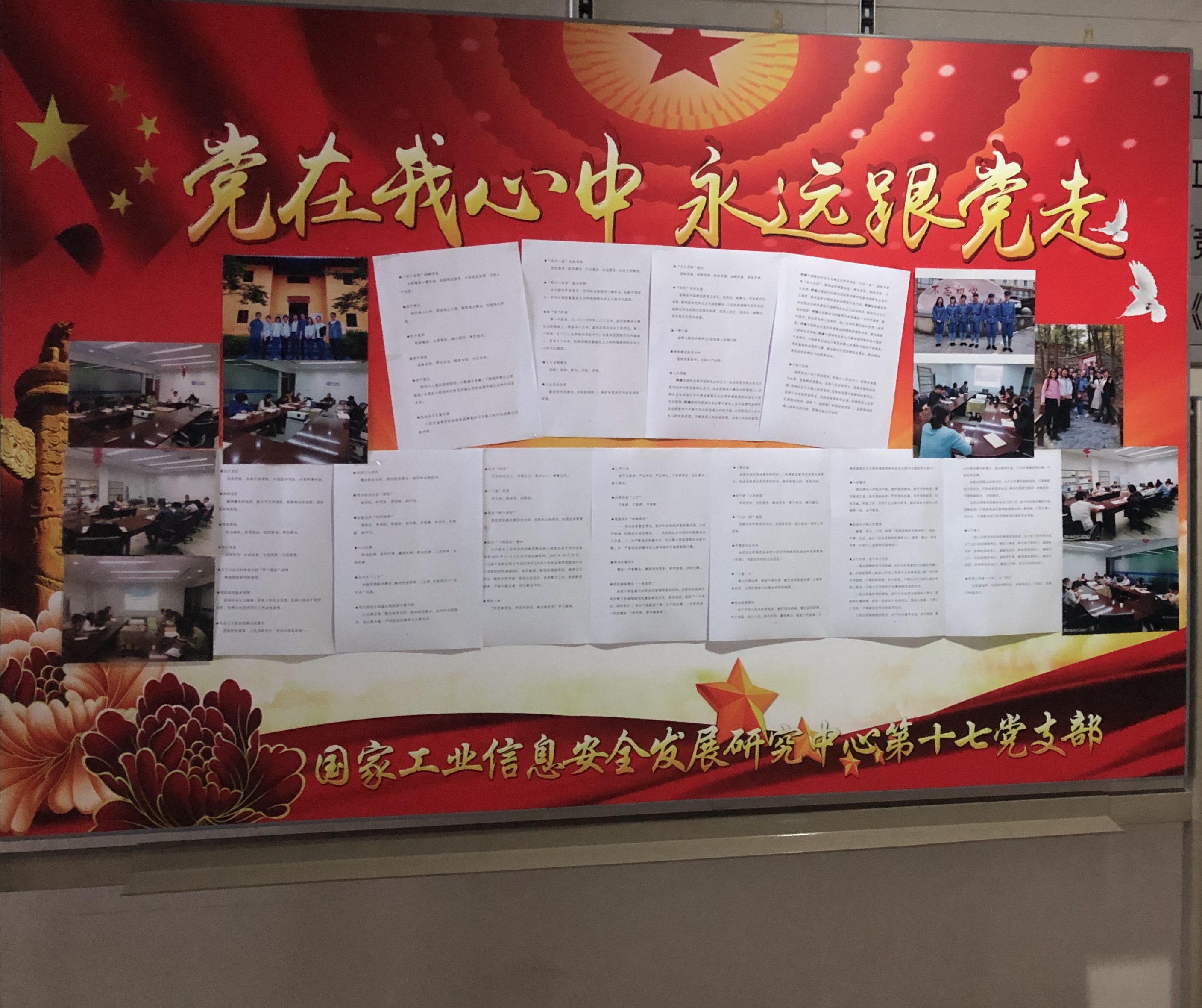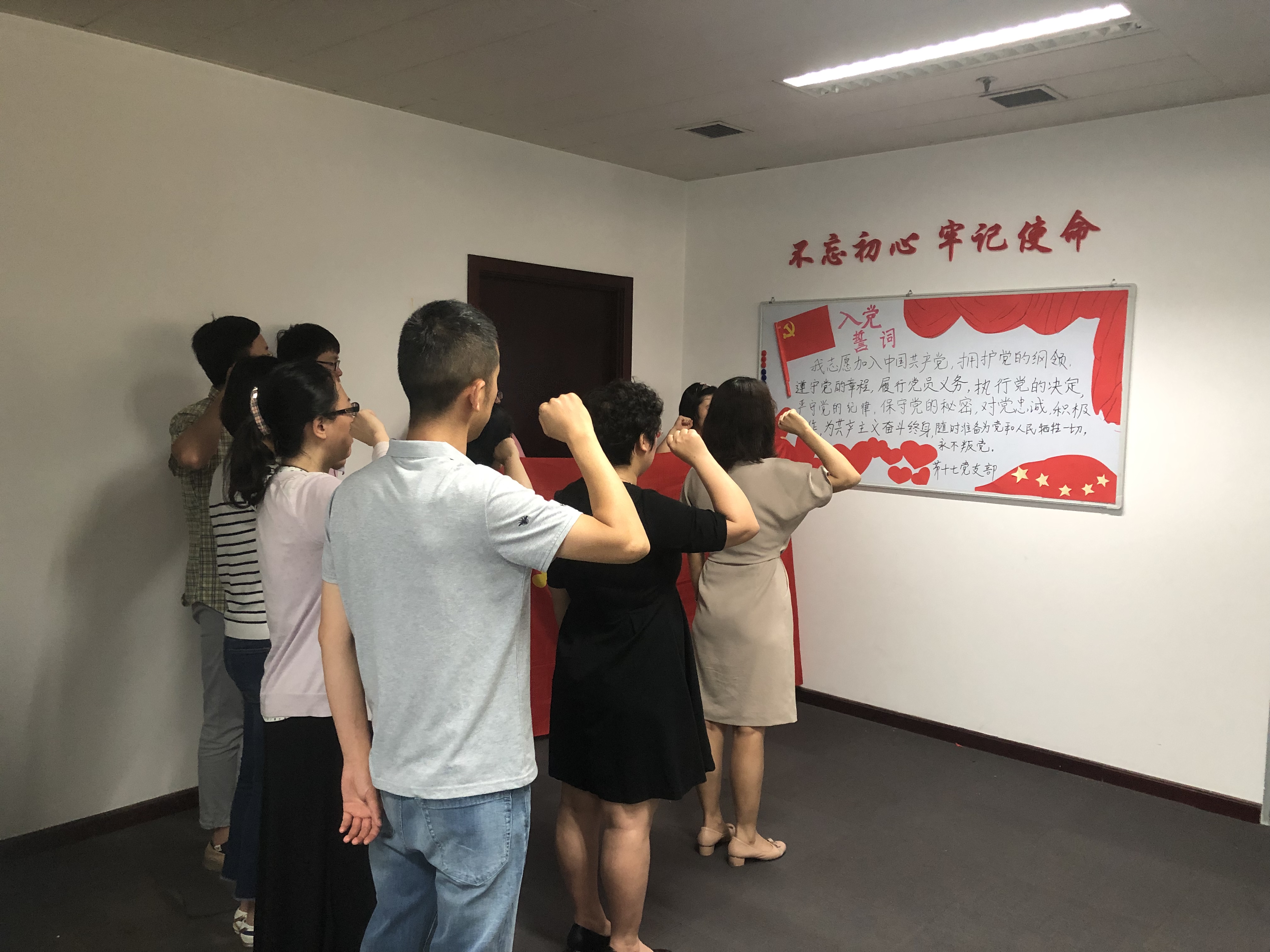 7月1日党的生日当天,第十七党支部全体党员一起布置了“不忘初心、牢记使命”宣传栏,共同策划、绘制、剪贴、撰写了主题板报。党员们亲手制作了党旗,并依次在板报上郑重写下入党誓词。