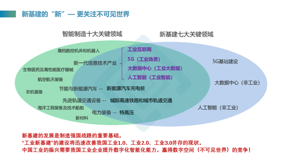 孙昕指出,我们将新基建的关键领域与智能制造的关键领域进行对比,发现其中重合的大部分是工业互联网、工业智能等新一代信息技术,而这些核心技术的应用场景,我们称之为“不可见世界”。新基建,是在数字经济时代,通过科技构建数据从传输到分析再到决策支持的基础设施,实现对物理空间背后不可见世界的管理。这也是工业新基建的核心,更是工业高质量发展的关键支撑。