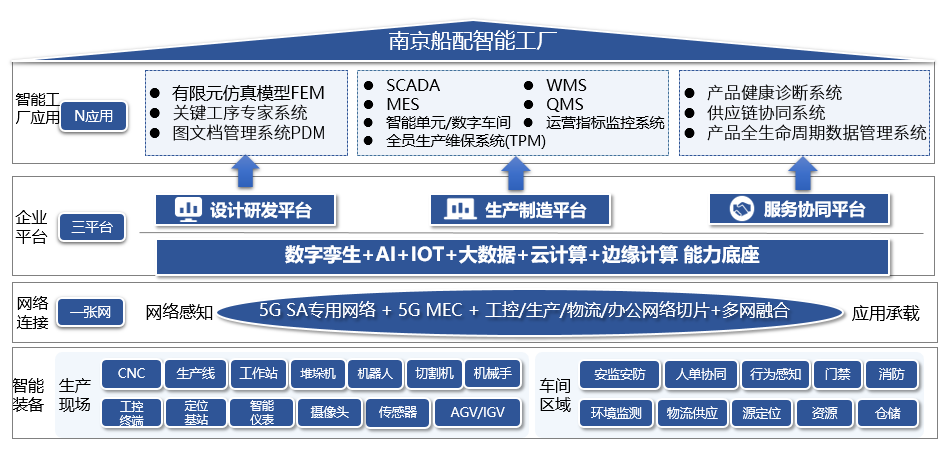 在企业资源和能力有限的条件下,南京船配聚焦高价值竞争优势,选择“企业战略目标-优势需求-能力打造”目标路径,从业务、运营、组织、技术等各个要素环节的数字化改造着手,围绕关键技术突破、高质量产业化、供应链高效协同,应用5G等新一代信息技术,开展关键工序建模仿真、专家系统建设,搭建数字化设计平台;开展智能单元/数字车间建设,搭建数字化制造平台;开展产供销流程信息化,搭建数字化服务平台。全面打造设计研发、生产制造、协同服务能力,逐步推进产品创新数字化、生产运营智能化、用户服务敏捷化、产业体系生态化。