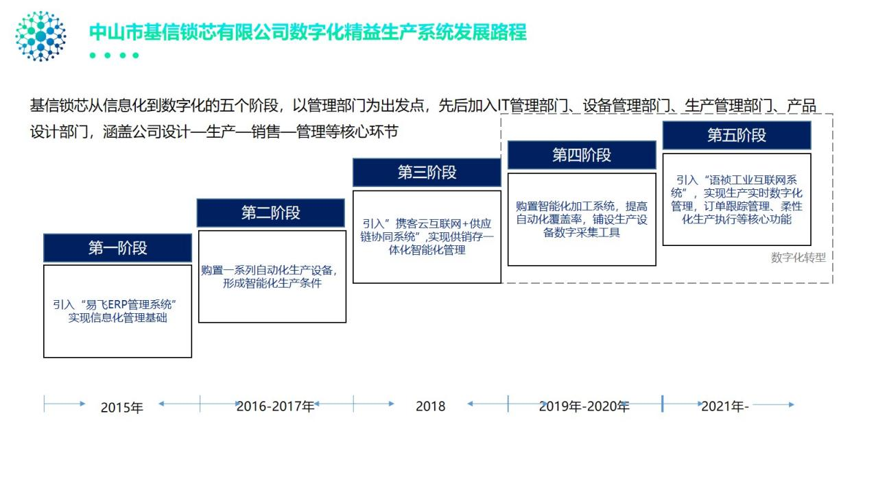 中山市基信锁芯有限公司数字化精益生产系统,以公司总经办为主导部门,连同公司管理部门、IT部门、设备部门、生产部门、研发部门等多个部门合作,以公司管理信息化--供销存一体智能化--生产管理执行数字化为三阶段目标,自2015年开始实施,至2021年初步完成数字化改造目标。