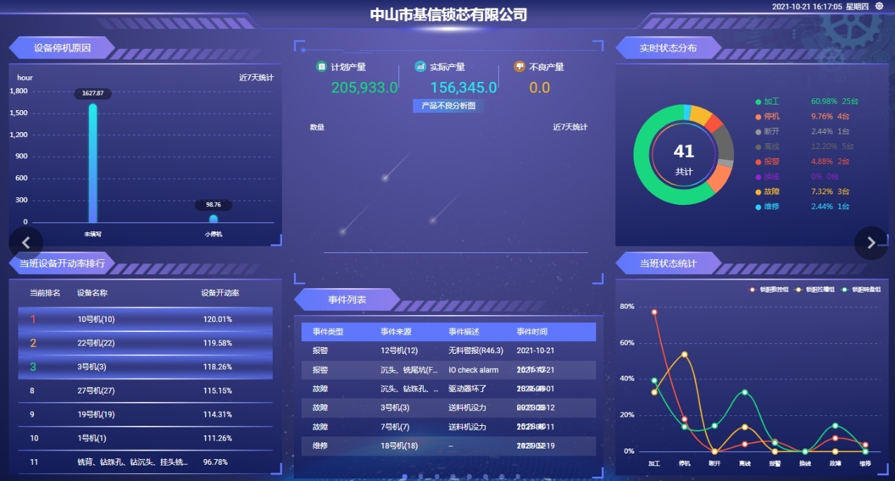 在软件的实施上,生产管理系统包含了设备状态监控、DNC、生产执行、ANDON、刀具管理、设备维保等子模块,结合数据采集终端进行设备联网与数据采集,结合精益生产的理论基础,在平台上进行数据建模、统计与分析,形成科学的生产制造数据分析报表,辅助生产管理者及时处置生产异常,辅助企业管理者快速进行管理决策,助力企业提高制造效率与品质,降低制造成本。