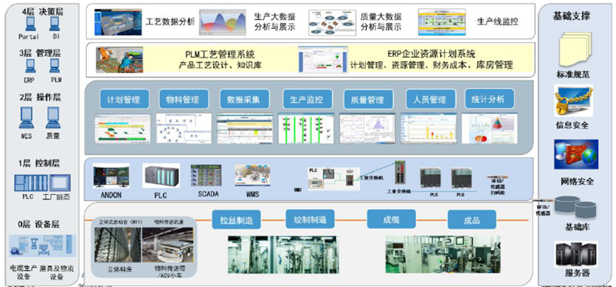 建设数字化工厂是尚纬股份高质量发展战略的核心内容,是企业走“高端化、差异化、智能化、国际化”战略发展道路的核心支撑。尚纬股份数字化工厂建设分为基础设施建设、信息平台完善、综合应用创新3个阶段,目前已初步完成三个阶段的主体计划,并成功构建设备、控制、操作、管理、决策五层管理,已初步建成电缆行业领先的数字化工厂。