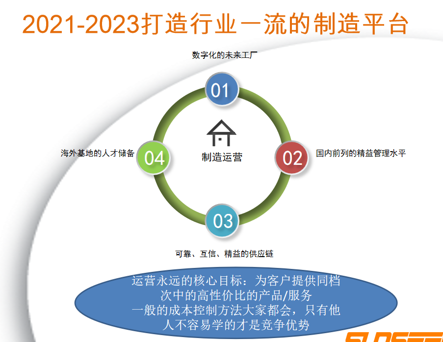 具体来讲,在产品智能化上继续扩大智能产品的研发投入,大幅提升国际市场占有率,在工厂智能化上打造一流的制造平台。同时,通过差异化的创新产品、高效的运营、智能研发、数字化制造、检验可视化数字化、供应链协同平台升级、数字化营销等方式,实现管理数字化、研发智能化、供应链协同数字化、生产可视化、运营决策智能化,达到国内前列的精益管理水平,使经营管理成本可控、高效、决策科学化,使企业发展良性可持续发展,为中国智造、企业及员工发展、智造生态圈建设等带来更大的价值和贡献。
