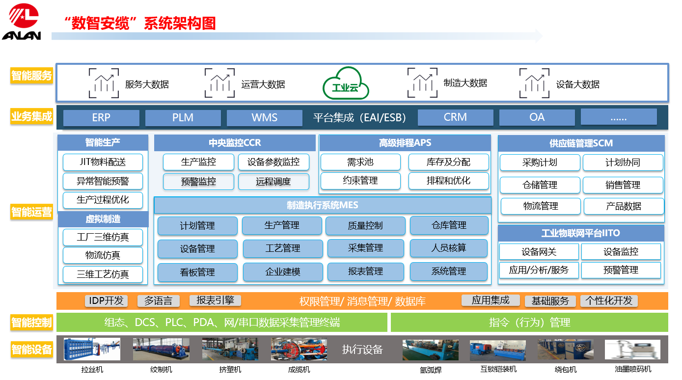 为了企业实现全面数智化、高质量发展、全面精益化管理的目标,公司决定进行数字化转型。通过打造“流程型数智安缆”模式,打造2大平台(工业互联,设备物联),拉通3大链条(供需链,产品链,管理链),建设省内电缆行业首个智能工厂,以达到降本提效、辅助决策、打通数字化供应链体系及树立行业标杆的目的。